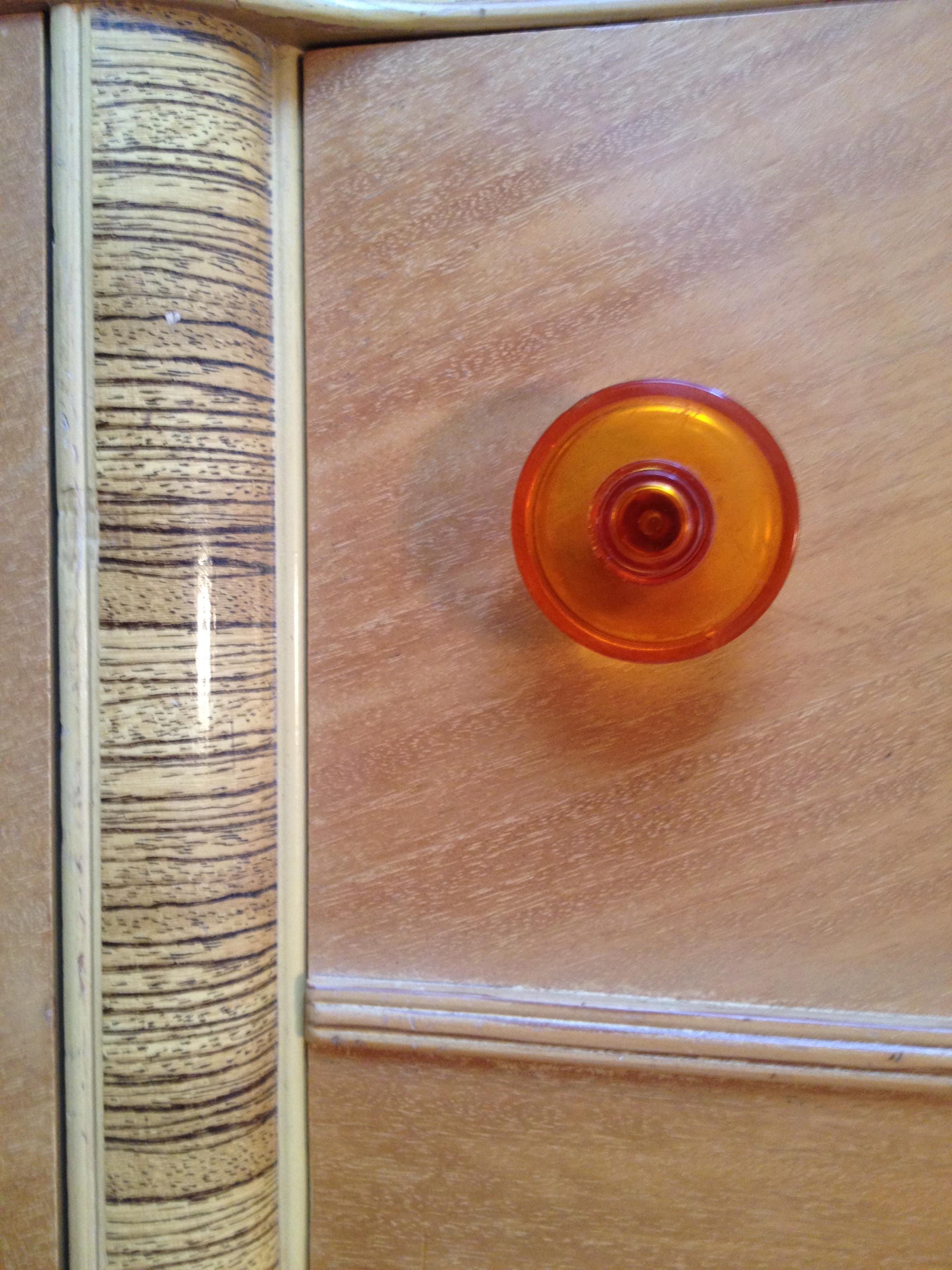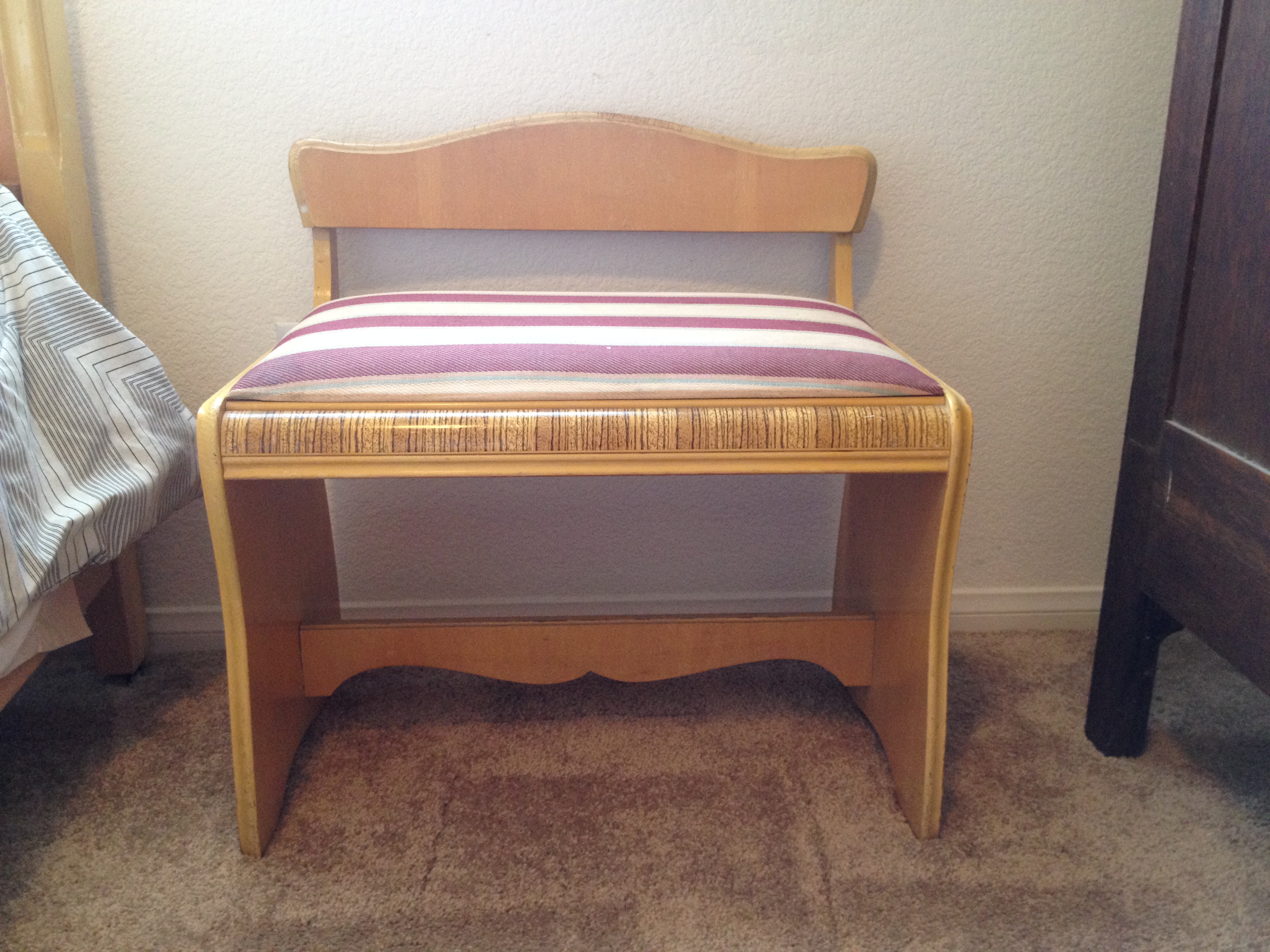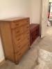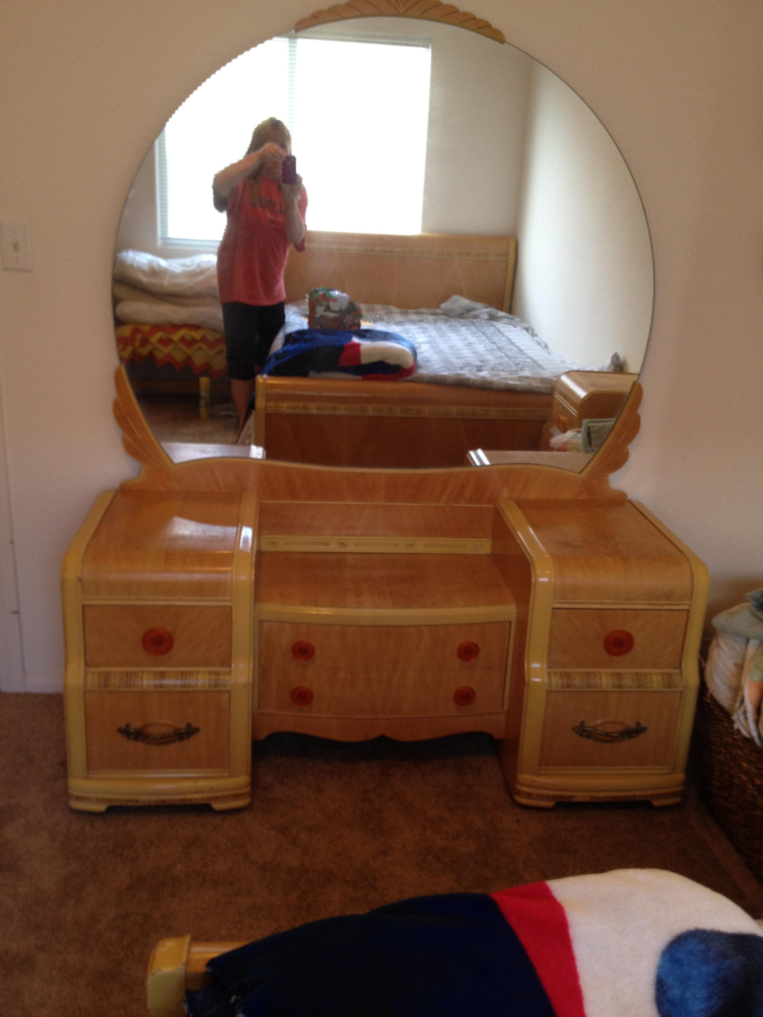 5 PIECE 1940"s bedroom set. 6 drawer dresser, 6 drawer vanity with mirror ans appolstered seat.  2 compartment (top drawer, bottom cabinet) end table. Full size bed frame, footboard & headboard with original springs.