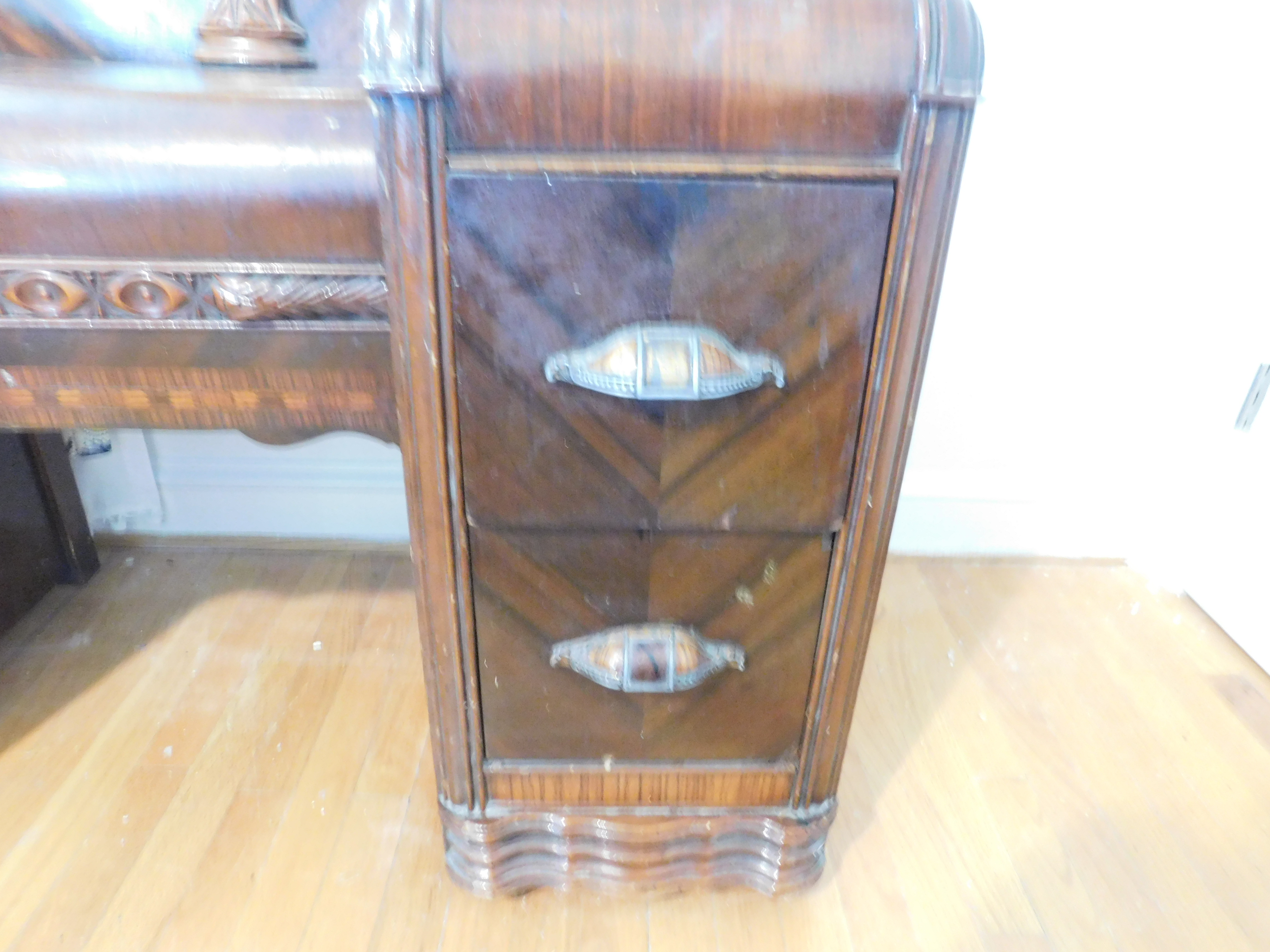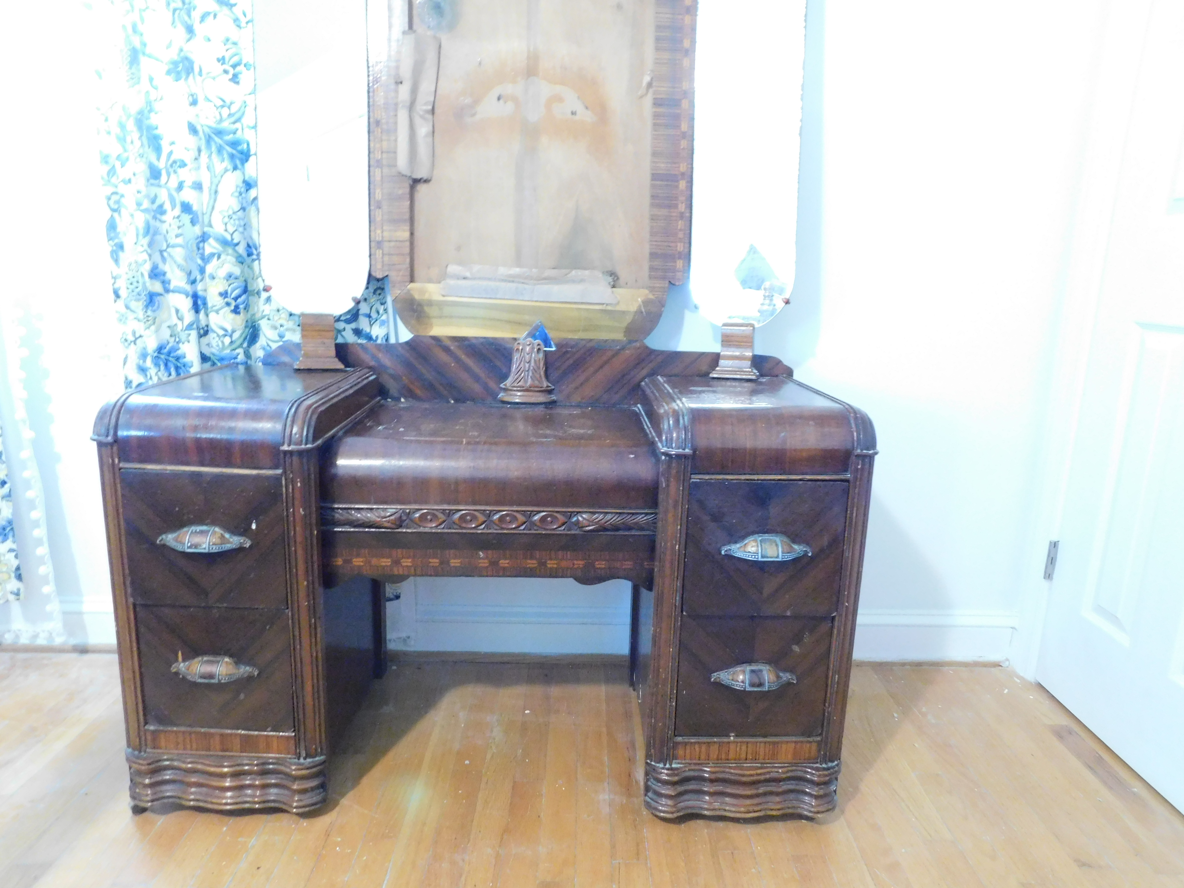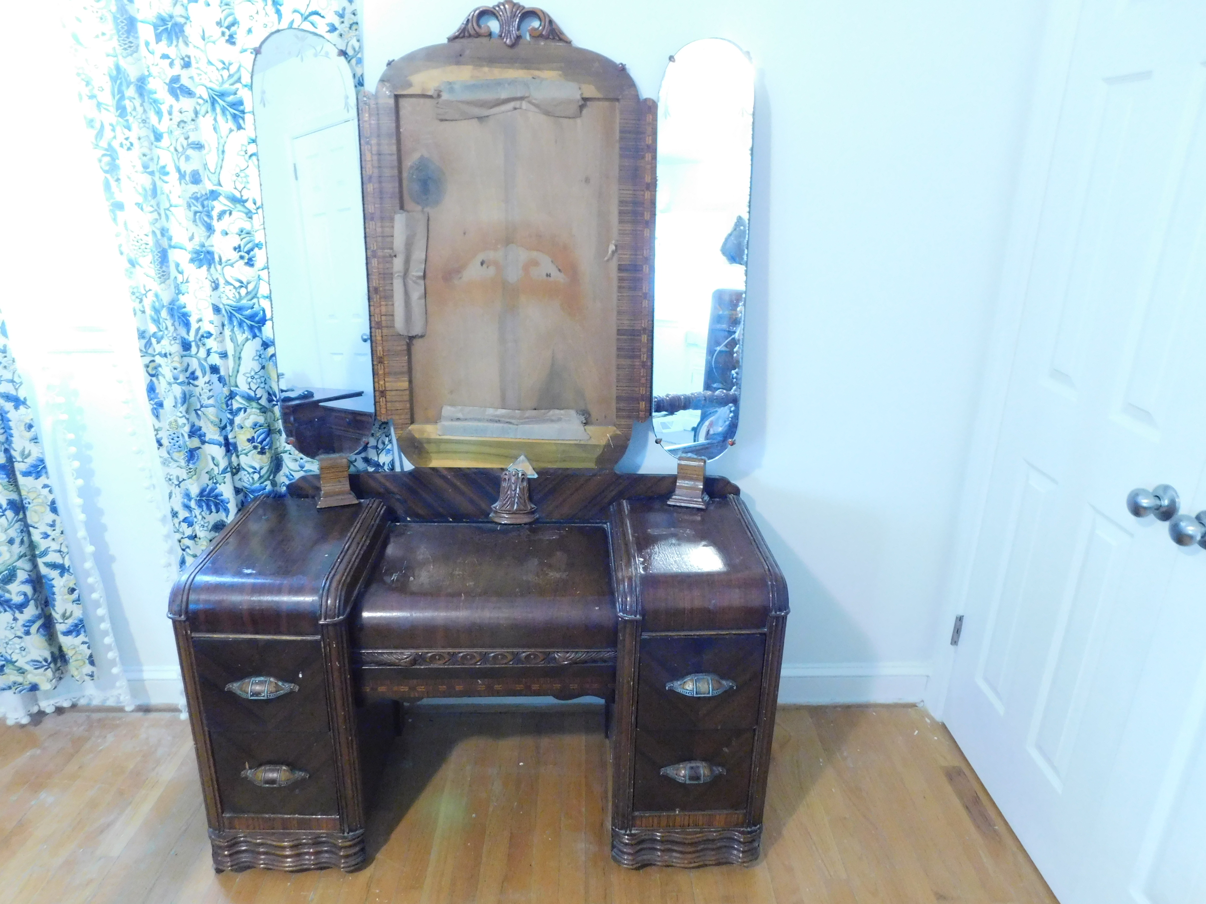 Bed set. Craved egg and dart design. Broke center mirror on dressing table/vanity.