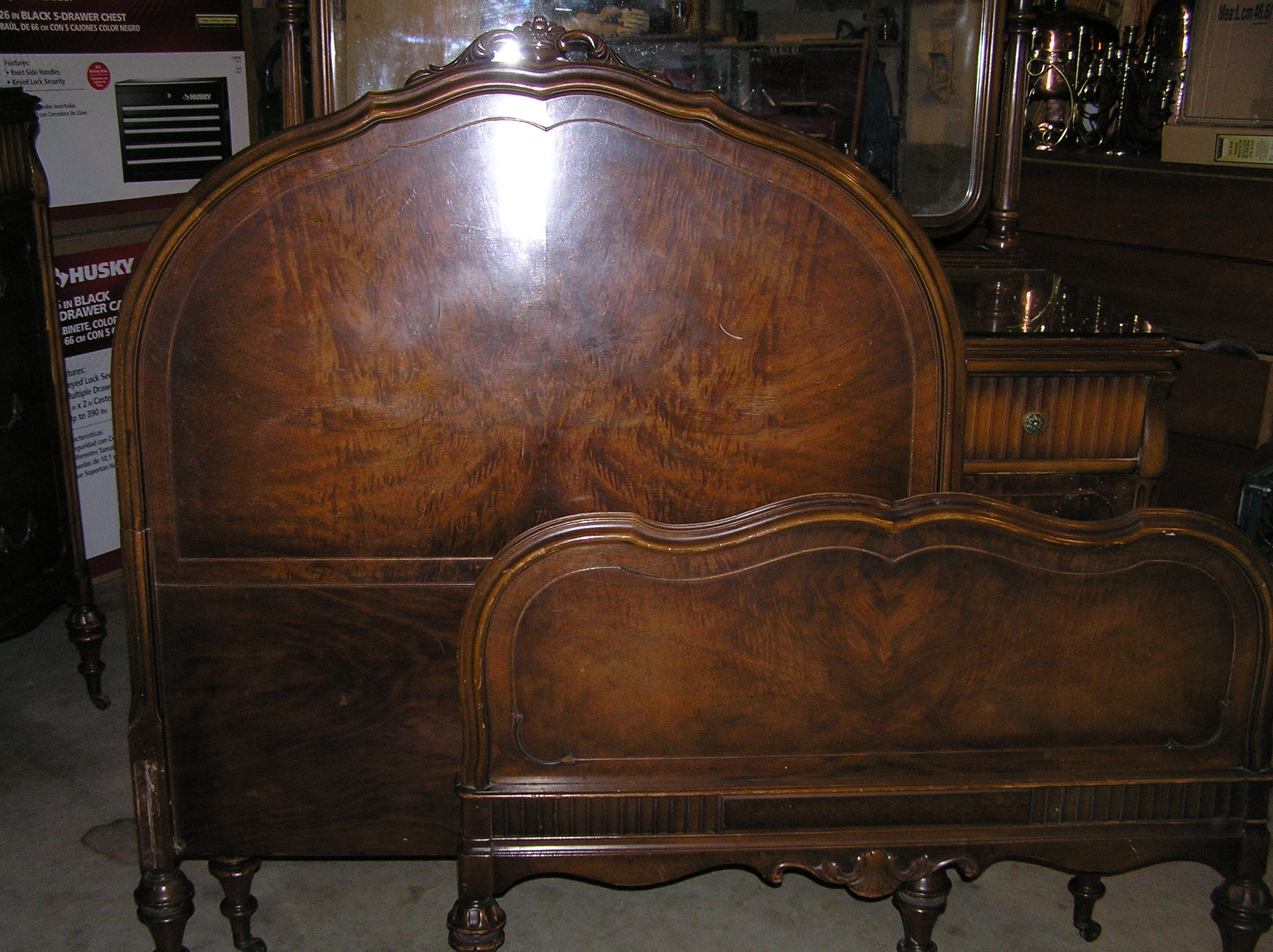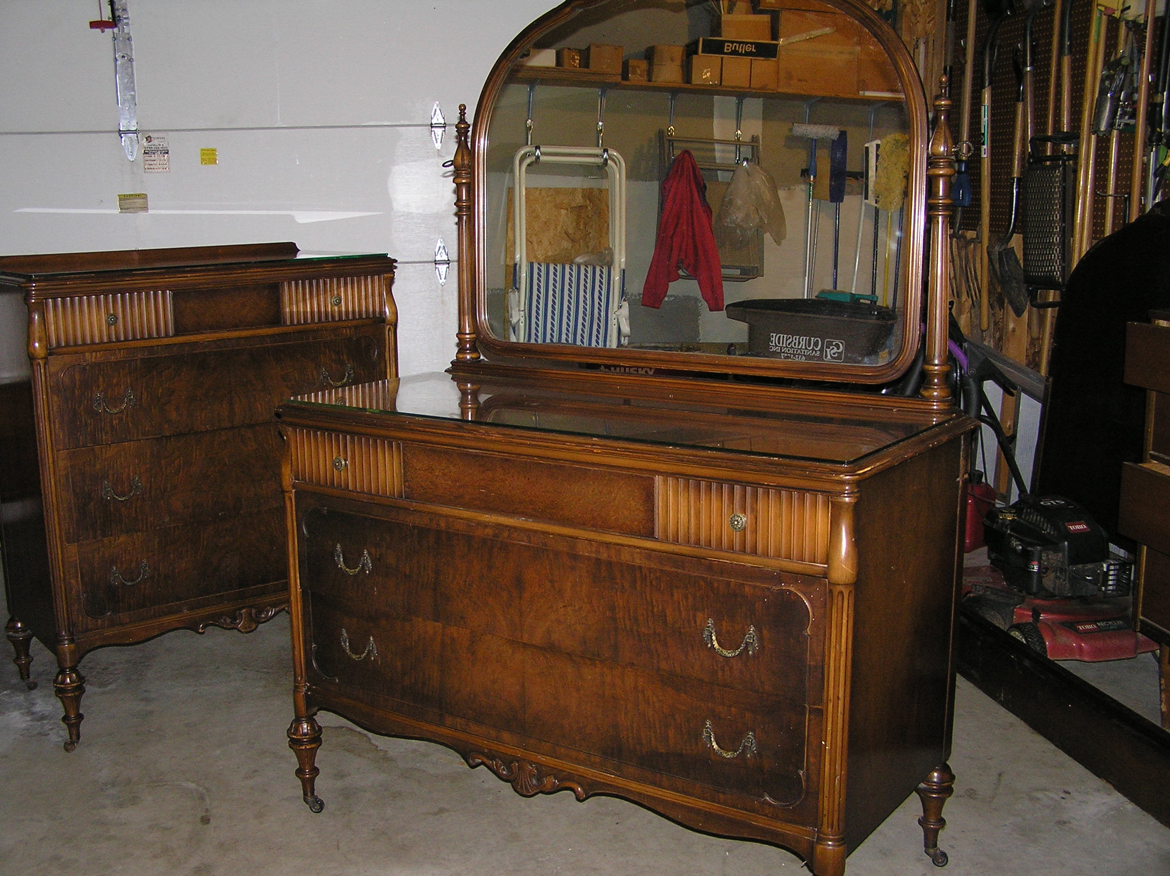 This bedroom set was owned by the former Mayor of Frontenac, Mo. and the owner of the Sporting News. There are 4 pieces to the set: Dresser with mirror, chest, vanity with mirror and bed with original rails. The dresser, chest and vanity have custom glass tops. The dresser, chest and vanity have dovetailed drawers and a sliding jewelry or coin tray/compartment.