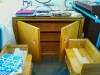 Hard wood.Hand carved.Curved Legs.3 drawers with original pulls.Dove tail on inside of drawers.Yellow finish with some gilding.