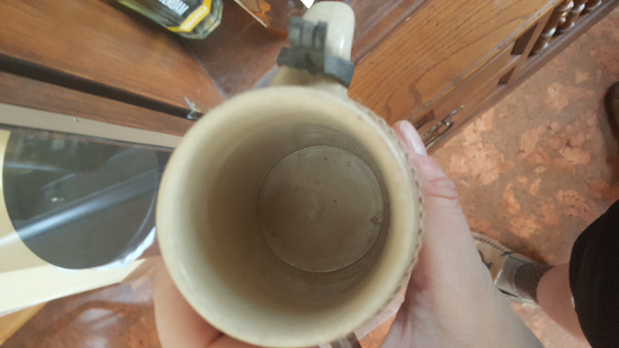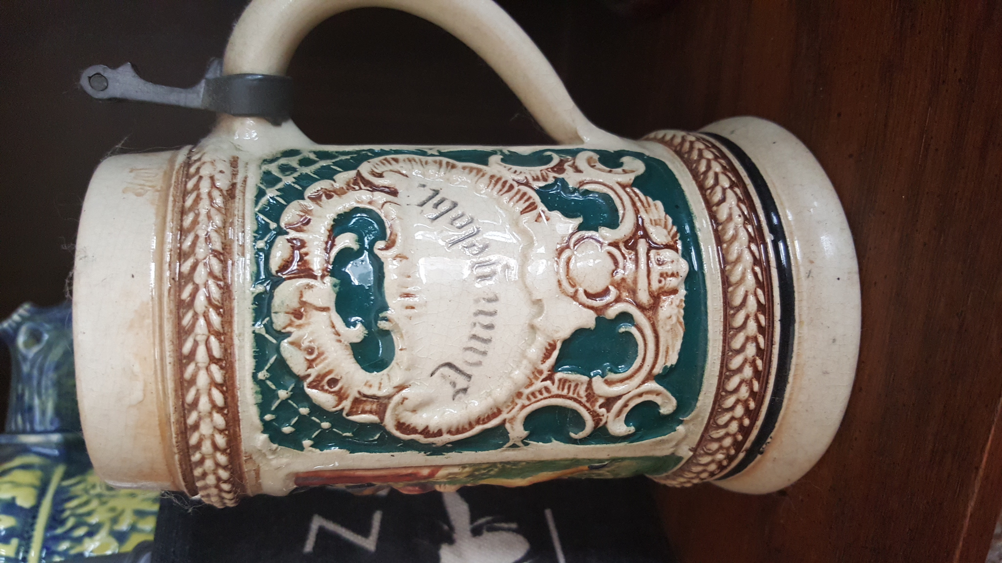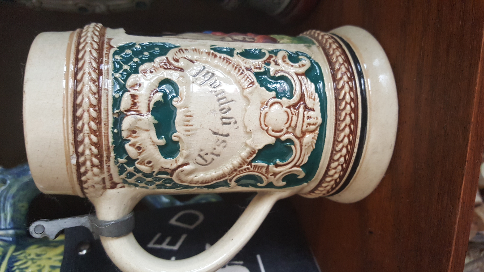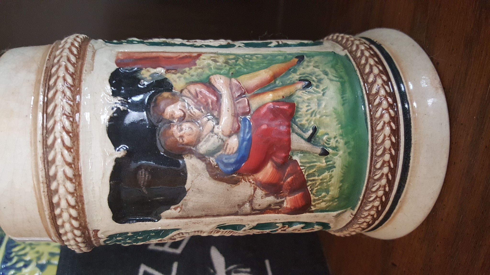 Beer stein. Germany. Has a couple sitting and kissing. Says "Erst geprobl" on one side and "Dann gelobl" on the other.