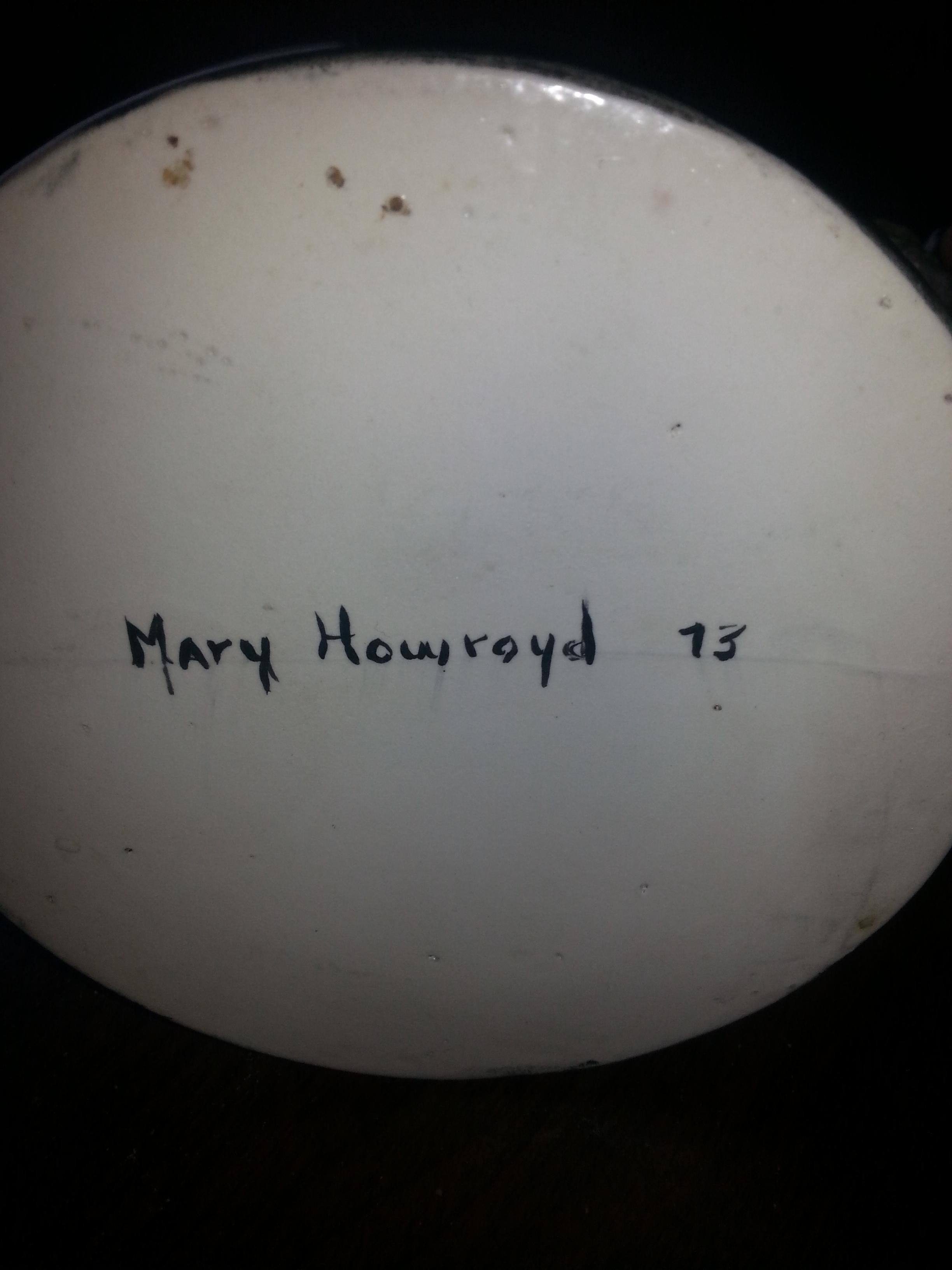 Hand painted. Has detachable lid.. bam on bottem is Mary Howroyd.