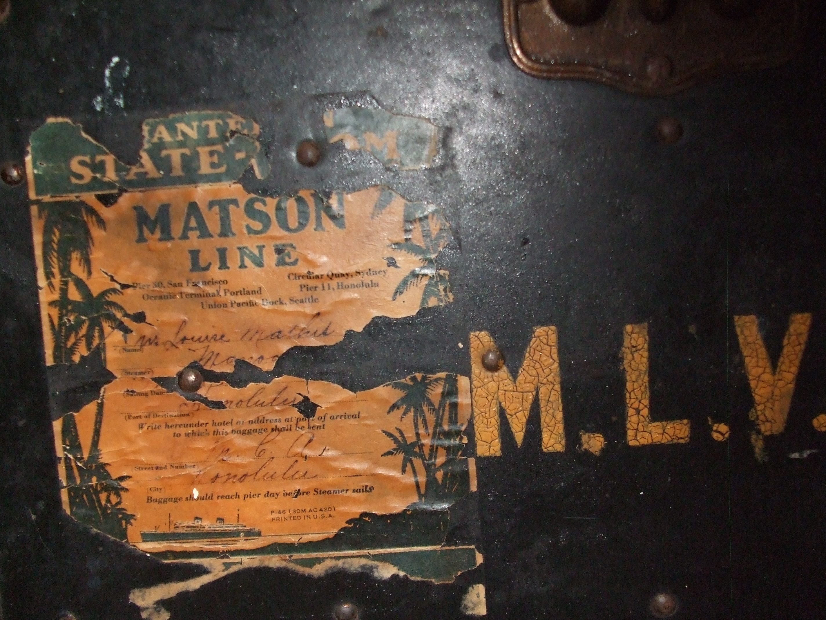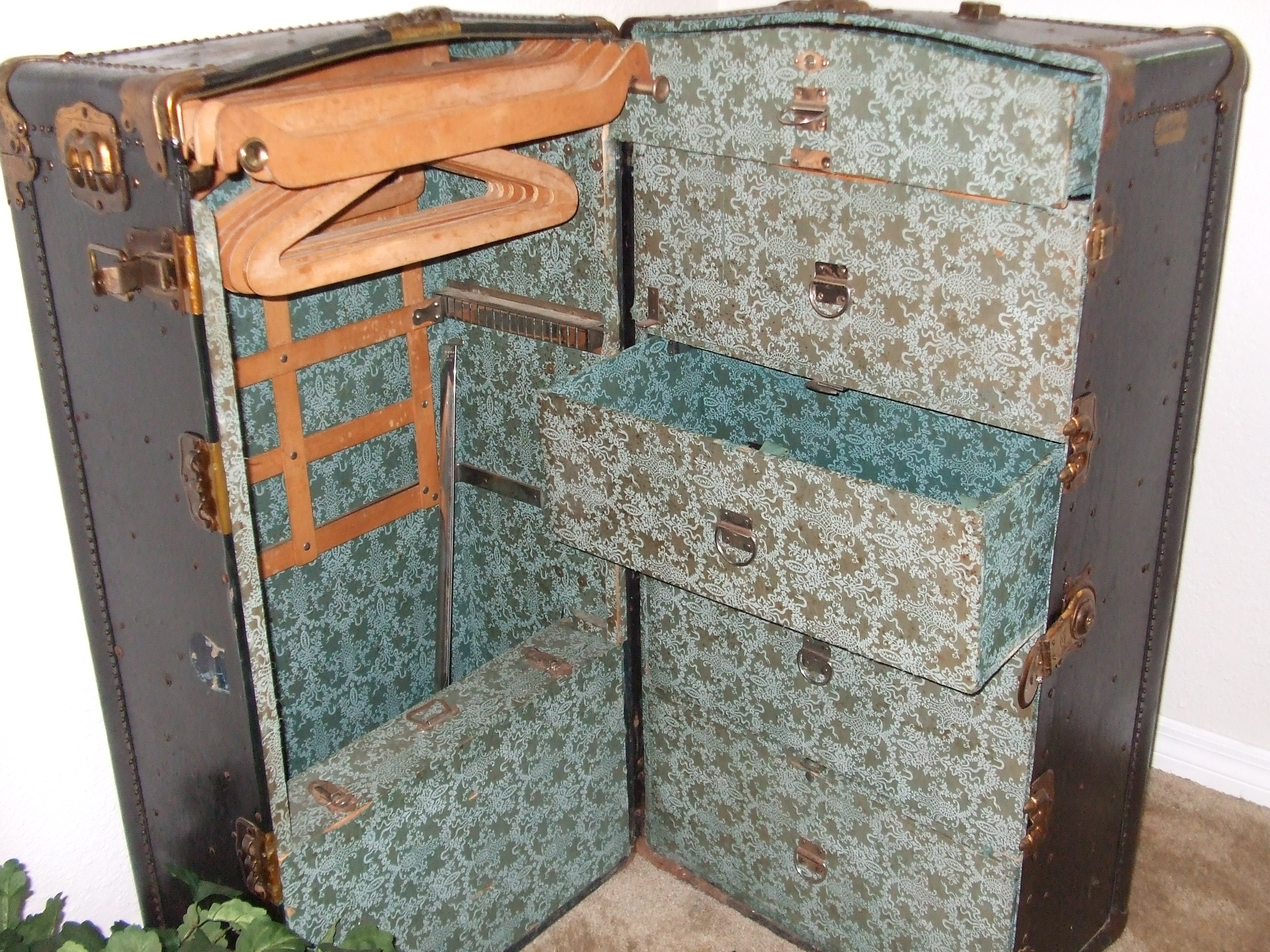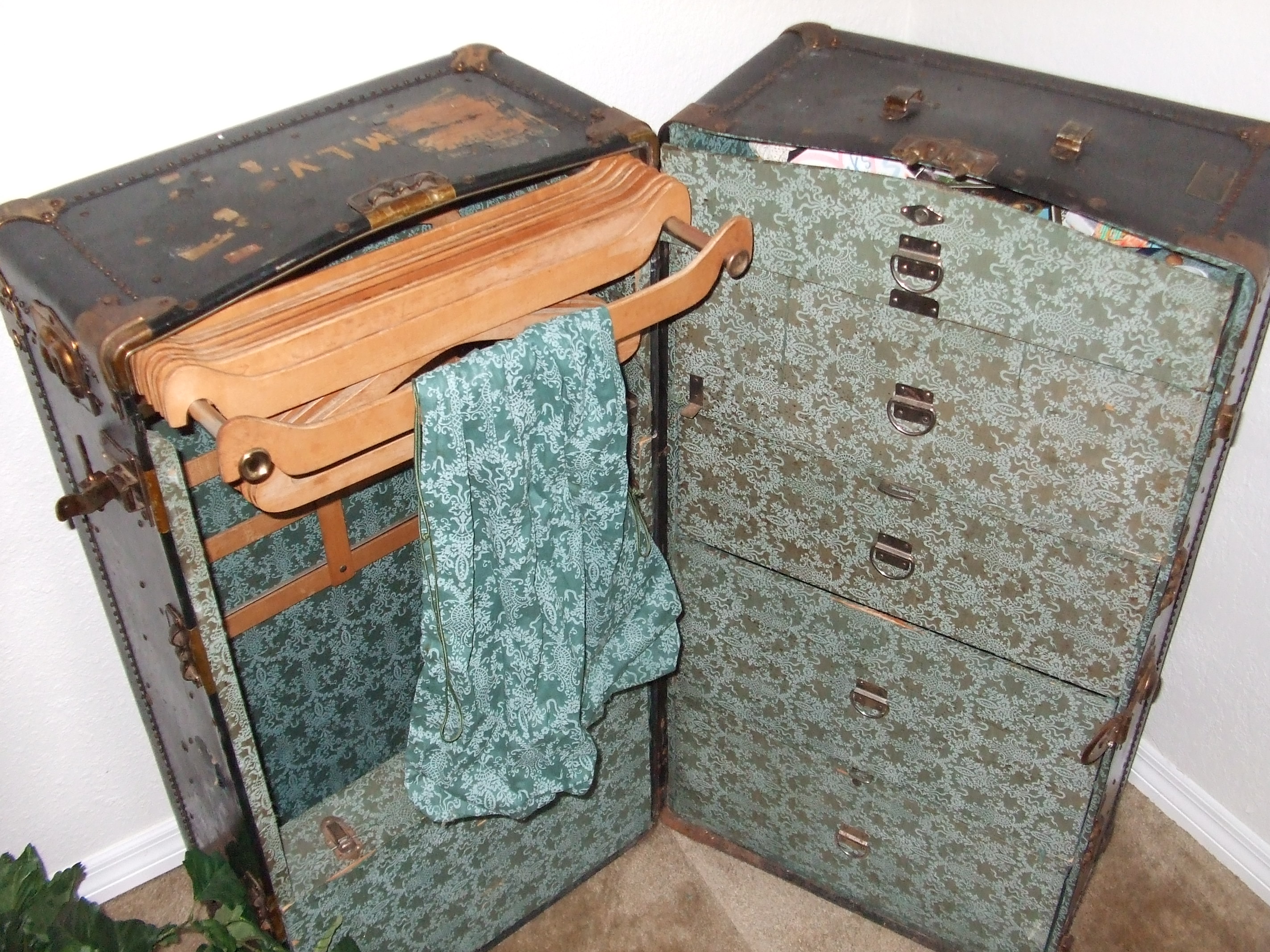 This is a arched top (as opposed to a flat top) steamer trunk manufactured by the Belber Trunk Company. It belonged to my greatgrandmother who emigrated from France in the 1920s. The trunk has a sticker on it indicating a trip to Honolulu, HI with various stops on the way. The trunk bears my great grandmother's initials MLV, Marie Louise Verdier. The inside has some wear and tear in the fabric covering the drawers, but all the original wooden hangers and rack are in perfect condidtion. The drawer lock bar is present as is the original laundry bag in matching fabric. There is a fabric covers case built to fit neatly inside as well. There are no significant damages or dents, just normal wear and tear for a steamer trunk of its age and usage. Some of the leather straps are missing.