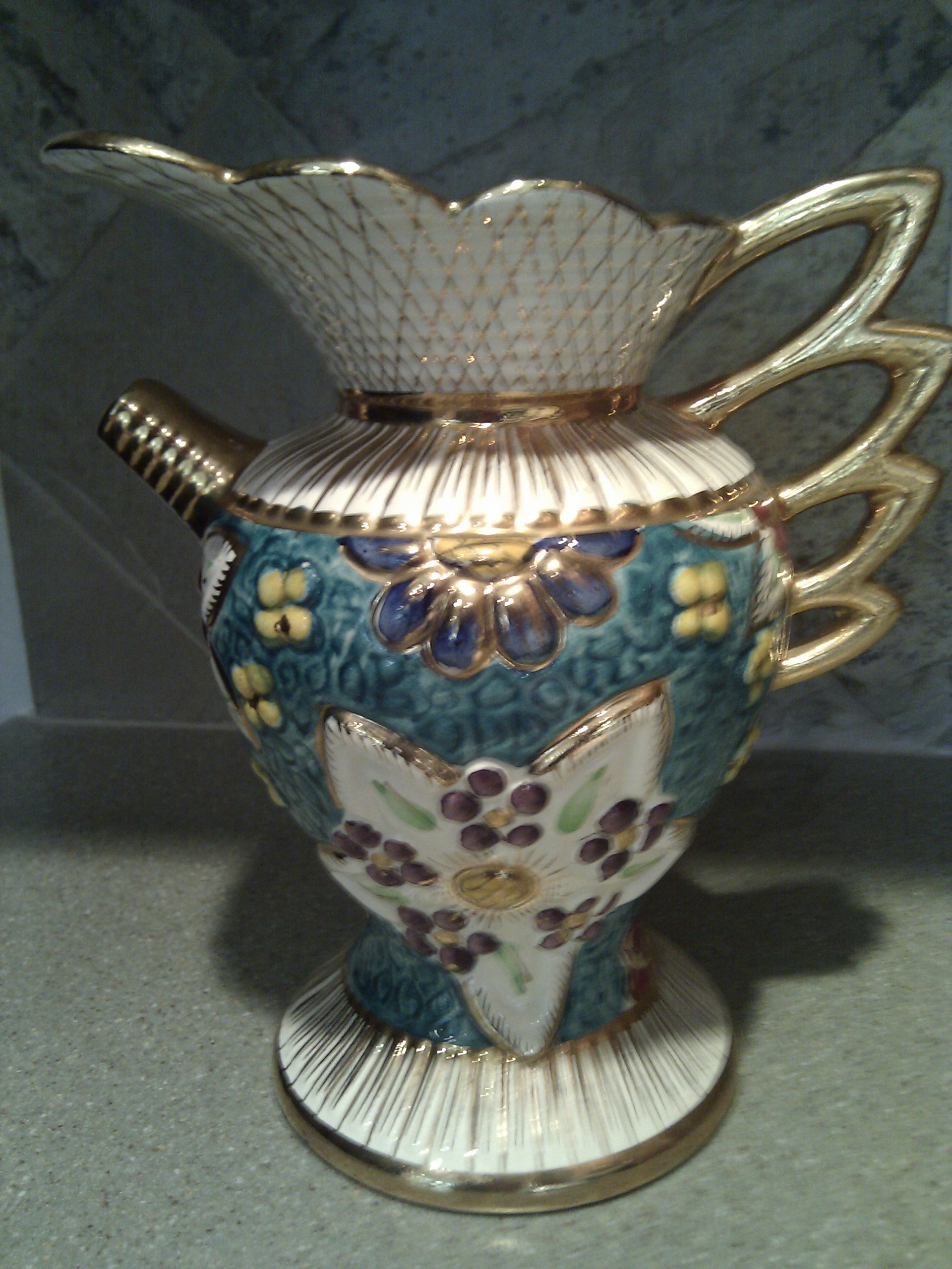 White, Gold, Blue Pitcher with Flowers. 15" tall. Excellent Condition