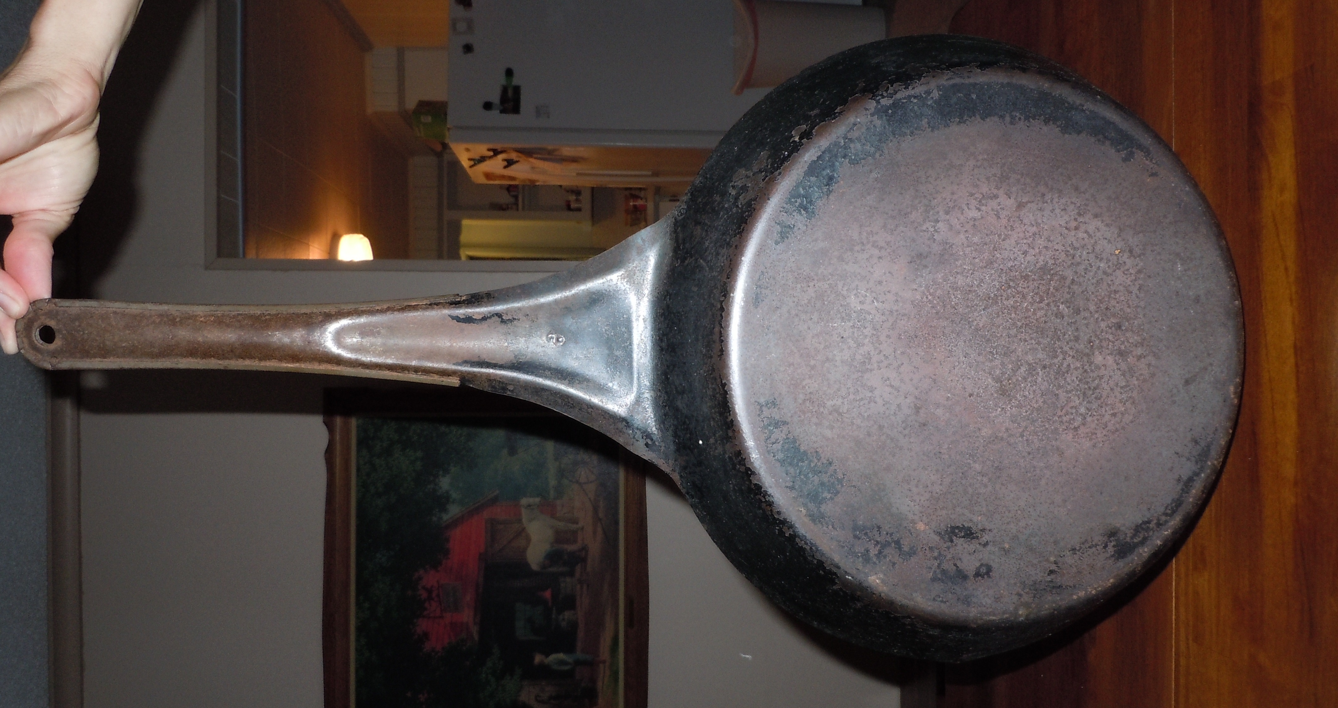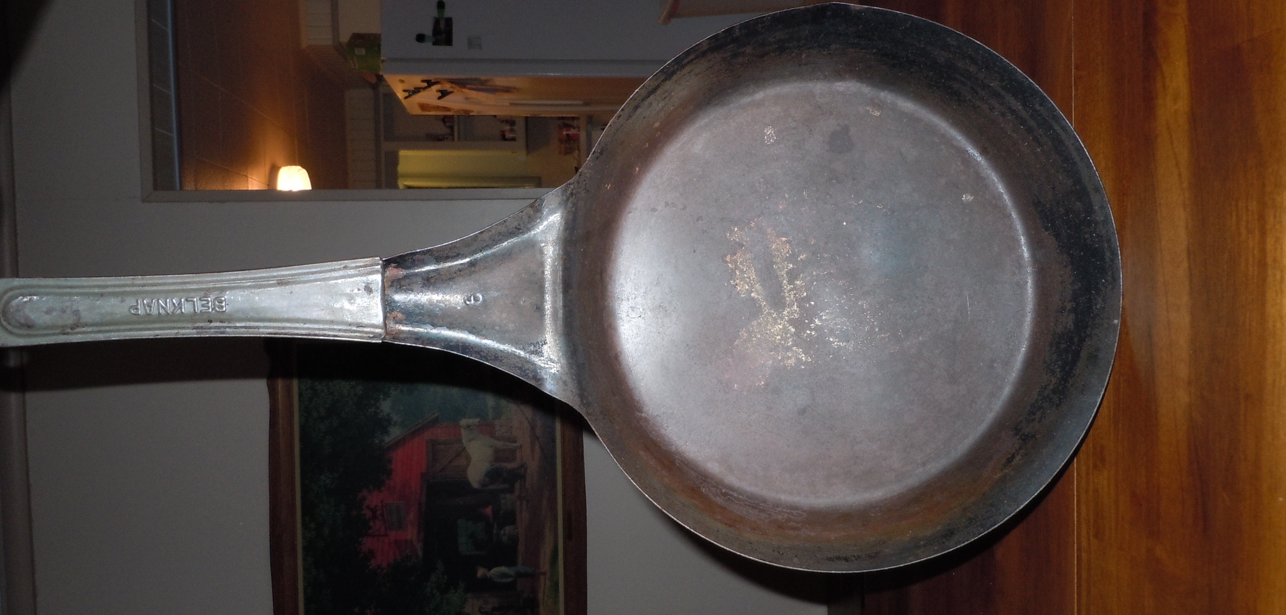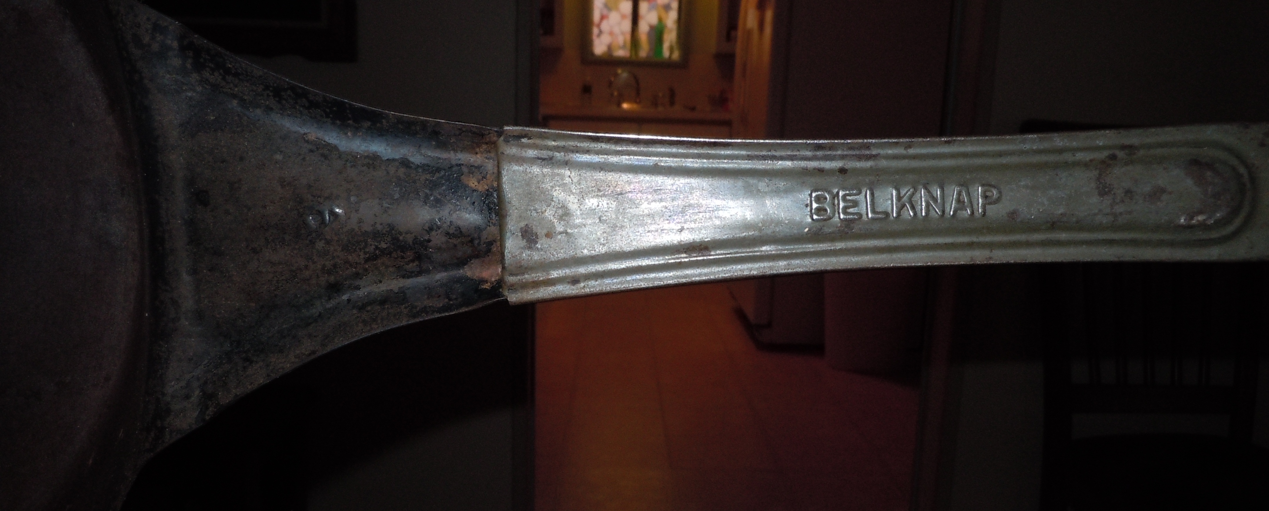 This pan was found in my mother's cabinet, but we do not know if it has any collectible or monetary value. It is approximately eleven inches in diameter and it has a long handle stamped with the number nine with the word Belknap stamped on the handle. We do not know how old it is, except that the manufacturer went out of business in the 80's. It's in fairly good condition, and would only need to be cleaned to remove carbonization.