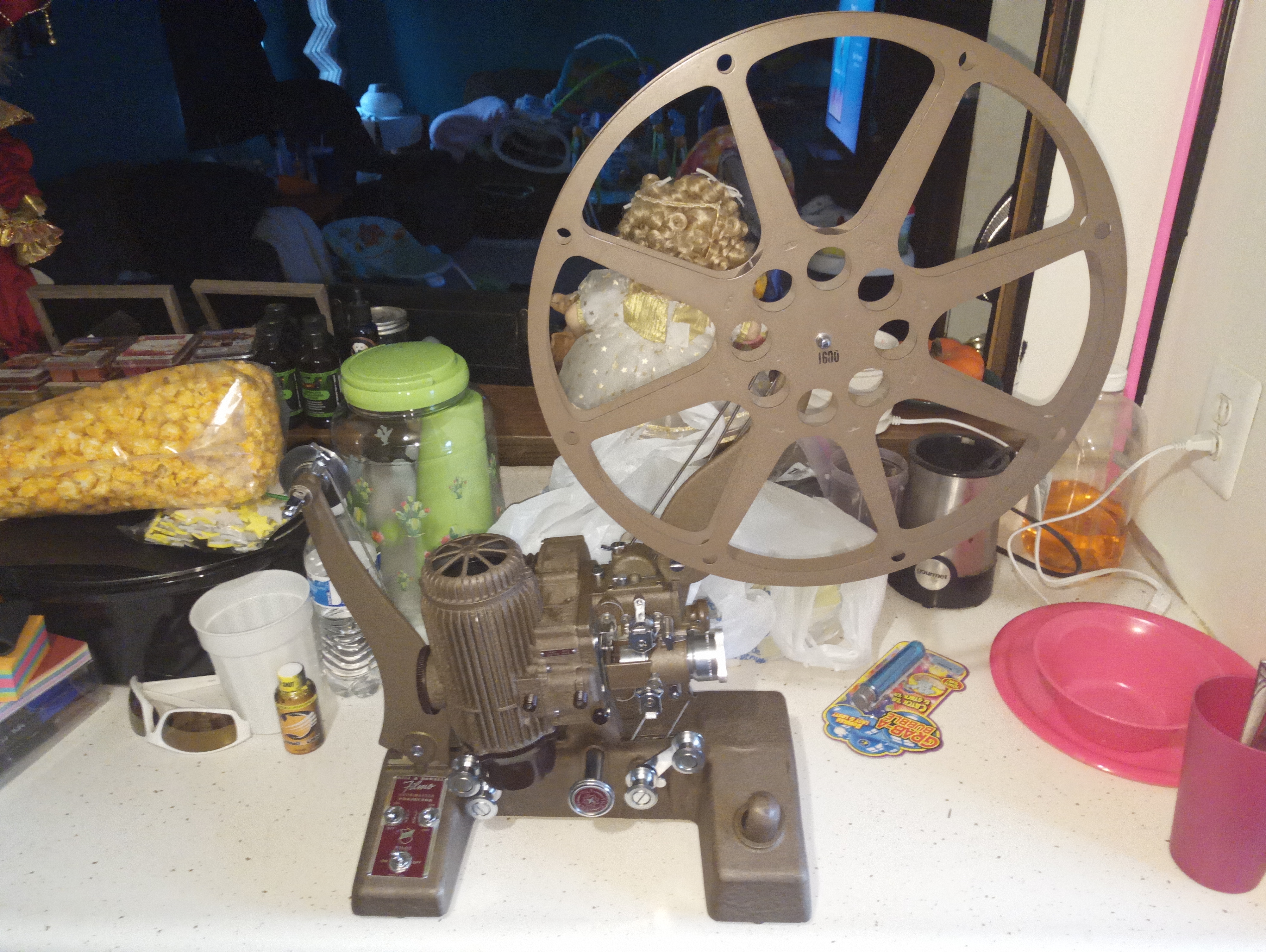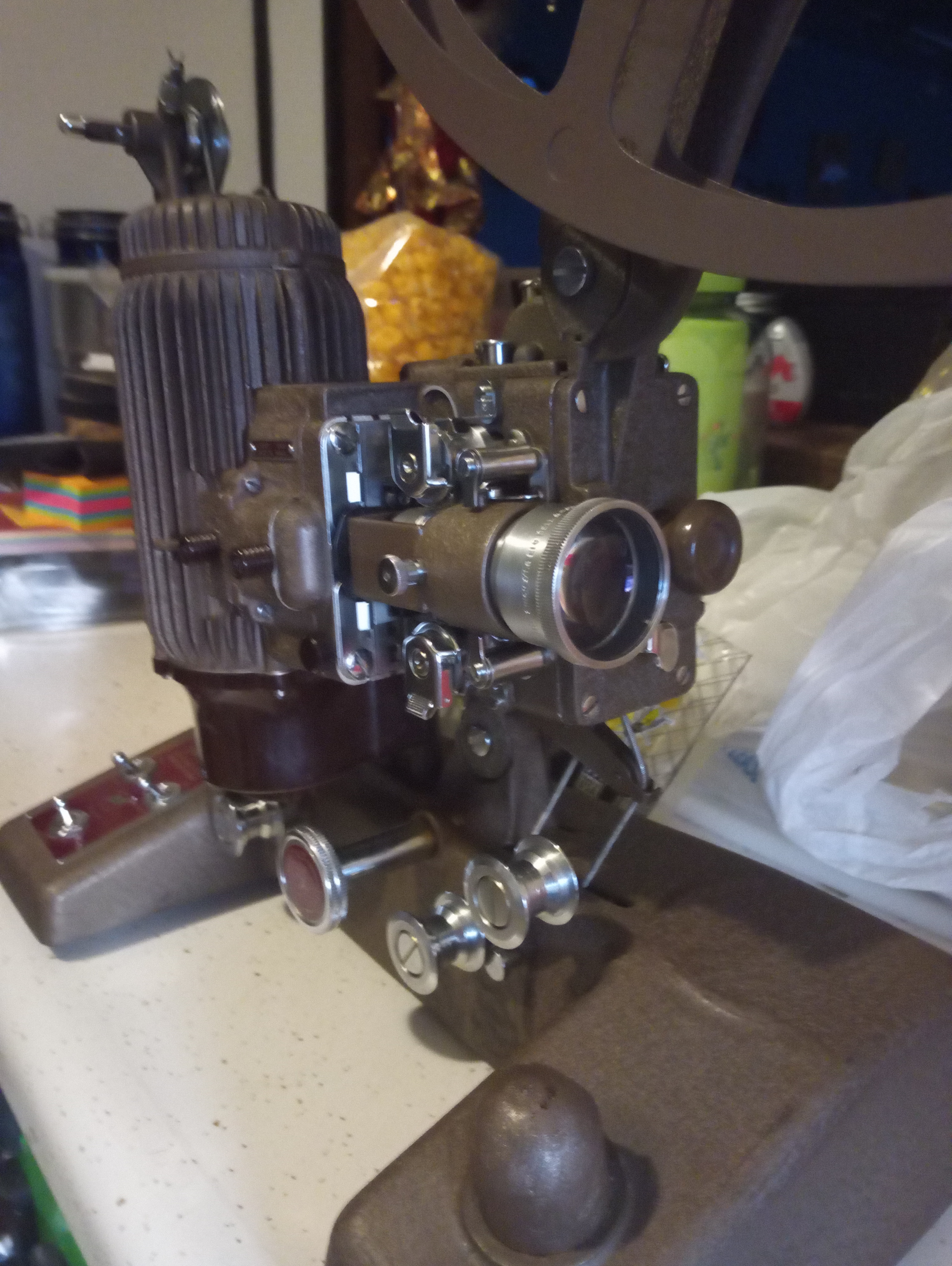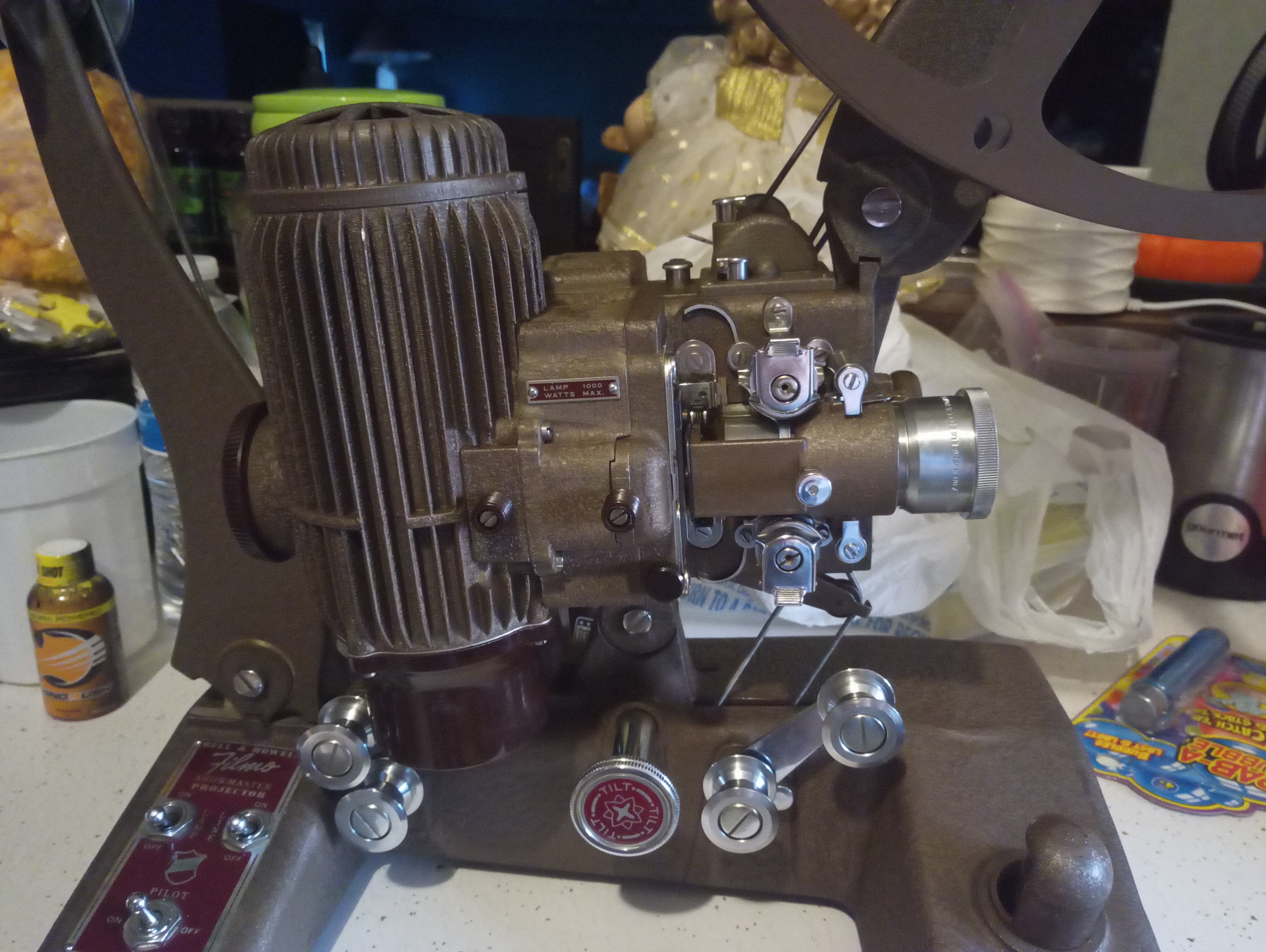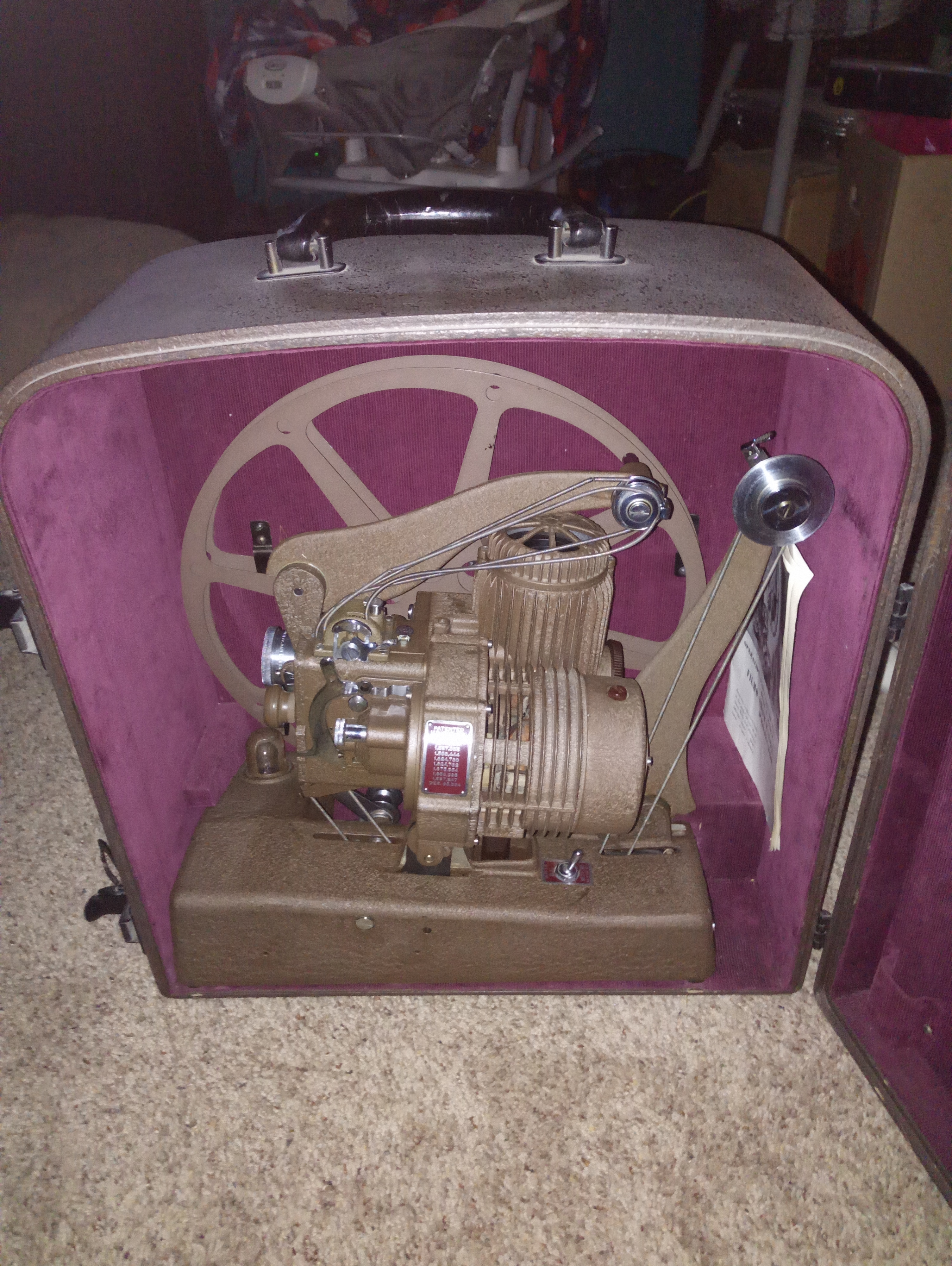 This is a Bell and Howell Filmo Showmaster Projector 129 H. It's in almost mint condition. The metal cables that turn the wheel are a little gapped in a couple spots, but it fully operates, and comes in a case that is in excellent condition.