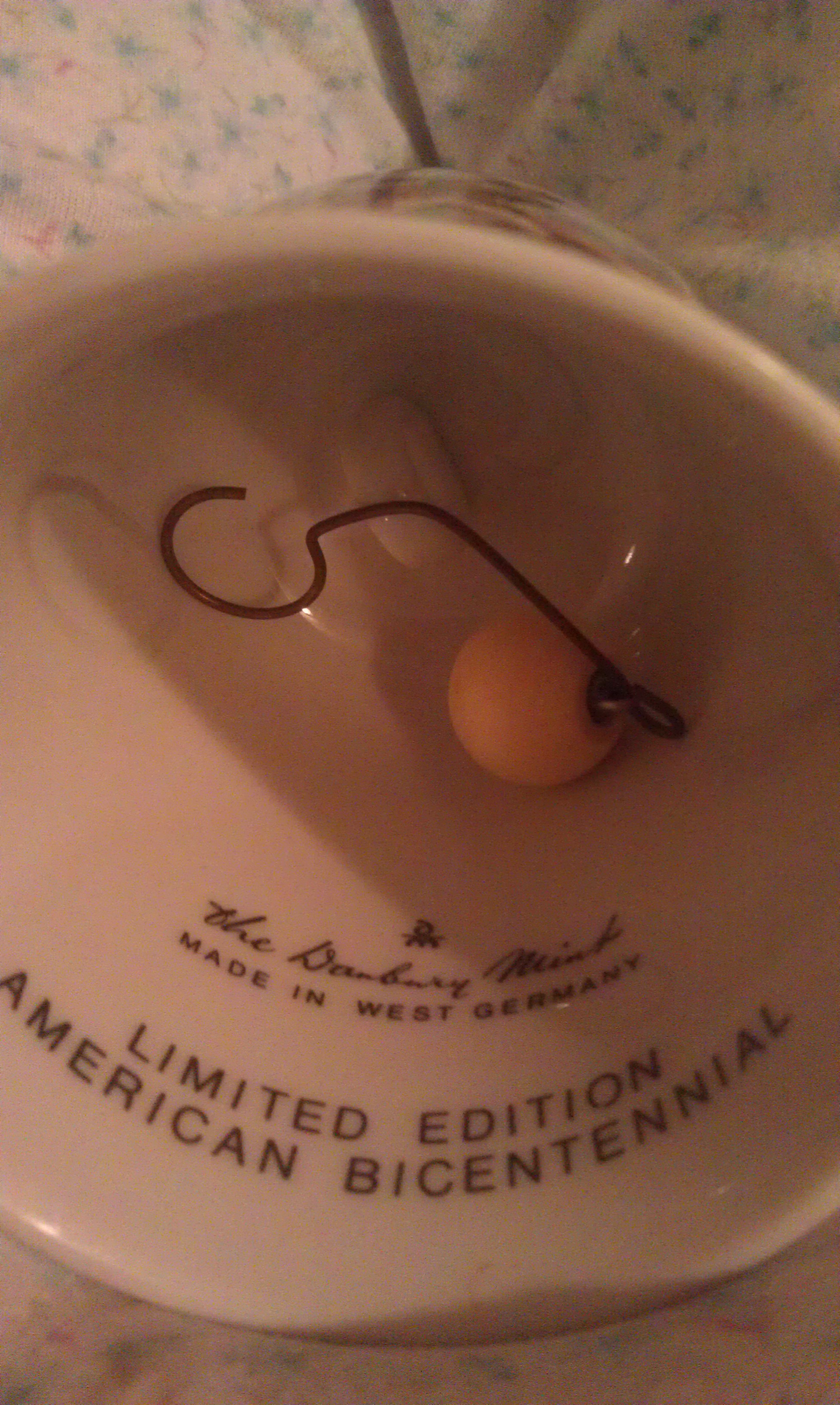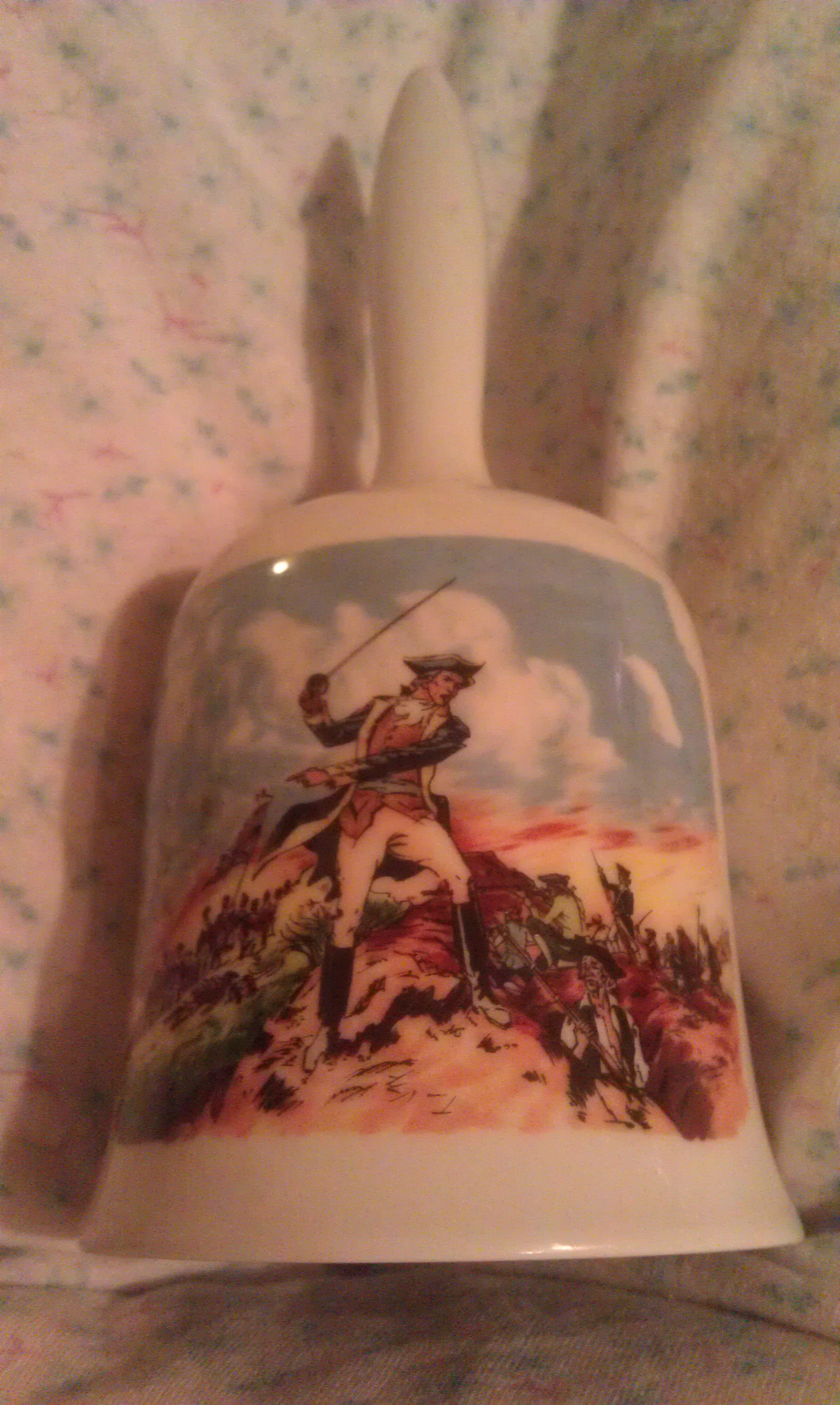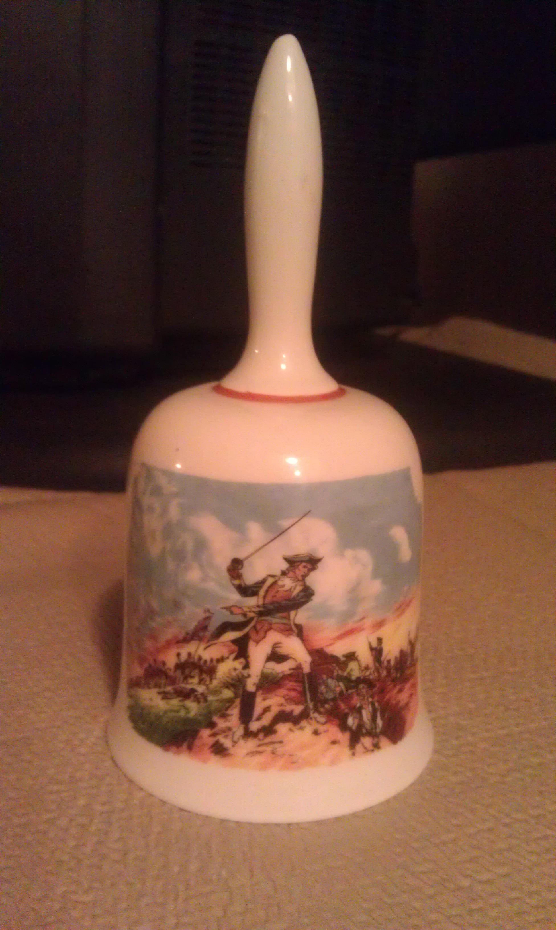 This bell I believe was bought in the 1970's. On the back it has "Battle Of Bunker Hill, June 17, 1775", with site of the battle. Inside bell it has "The Danbury Mint, Made In West Germany, Limited Edition, American Bicentennial". I believe it is porcelain. Picture of battle is on front. Does anyone know the value of this? Excellent condition. Thank you, Donna................................Does anyone know what this is worth?.