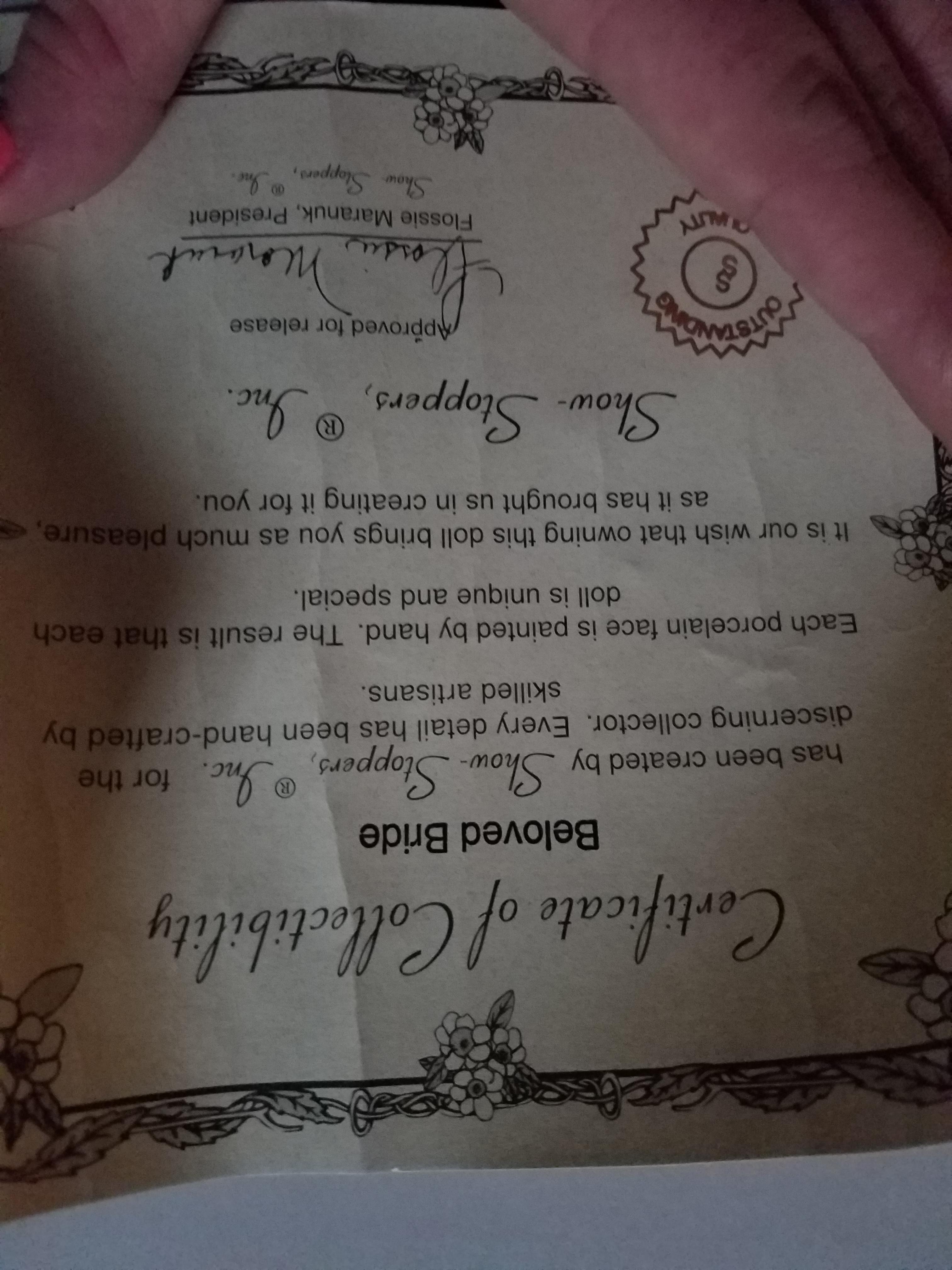beloved bride porcelain doll by the show stoppers inc. beautifull gown with beads original tags and collector certificate. still in great shape. R 345.
