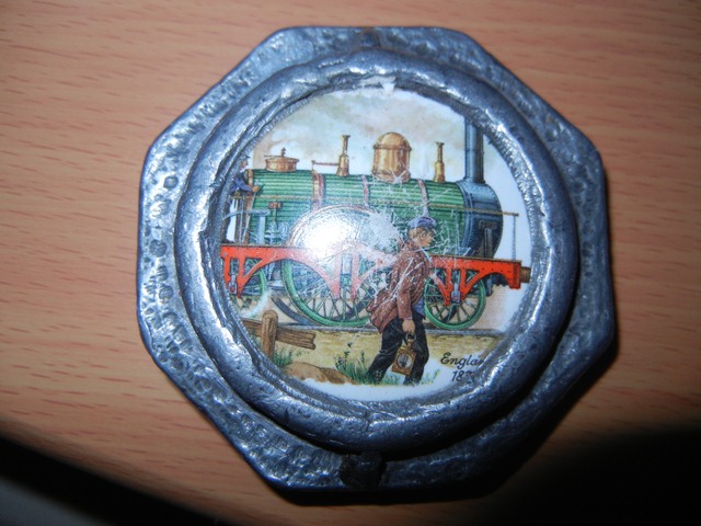 I have what looks to be a hand made belt buckle in the an octagon shape with a picture in the middle in the shape of a circle of a train engine and a man with a lantern in front of it and in the corner it was England 183...(the last number is covered under the metal of the belt buckle.