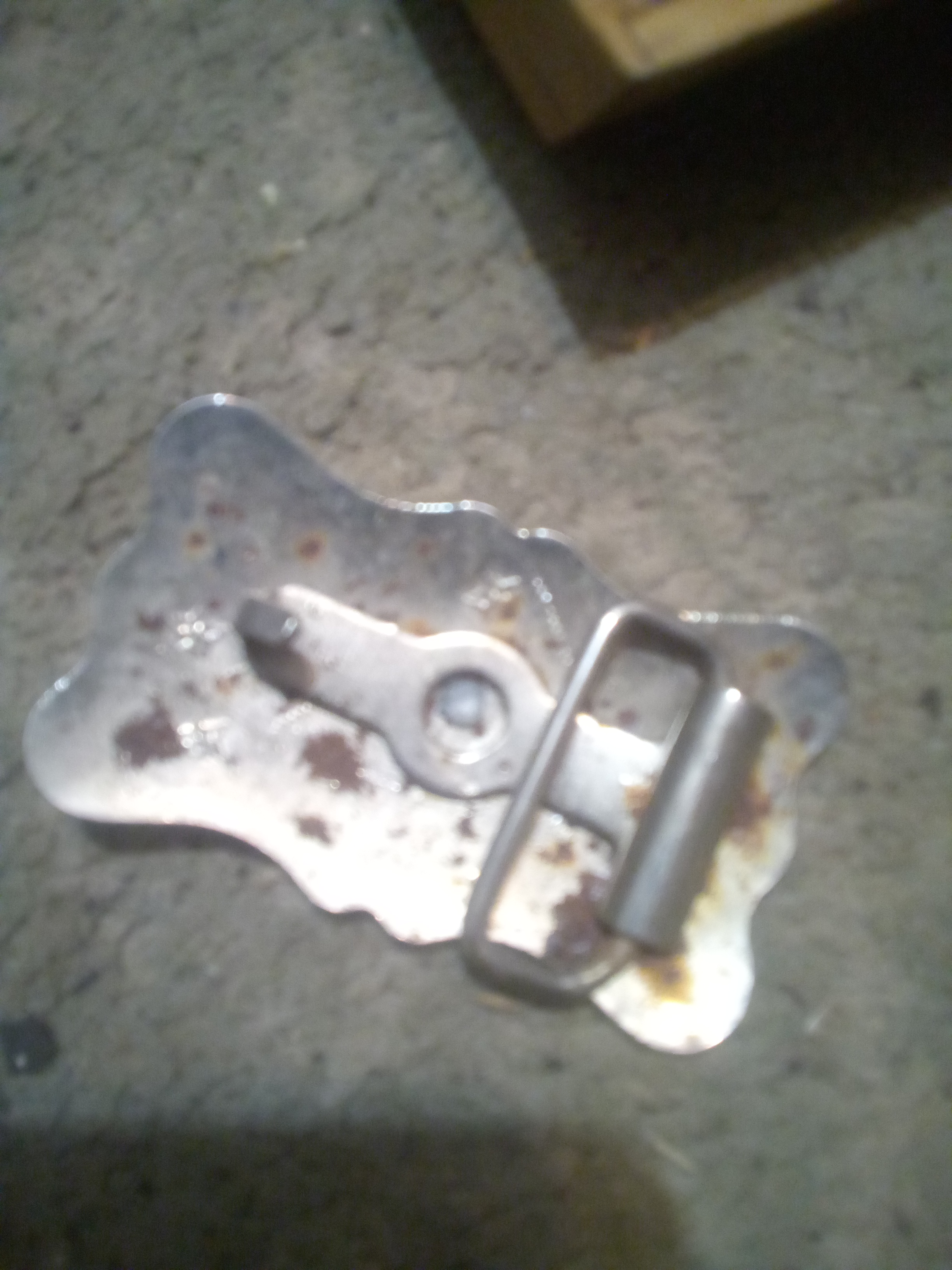 The belt buckle is in fair condition, showing signs of wear consistent with age. Notable wear includes surface scratches and some rust on the reverse side, which may affect its aesthetic but not its functionality. The horse head design remains intact and is clearly visible.