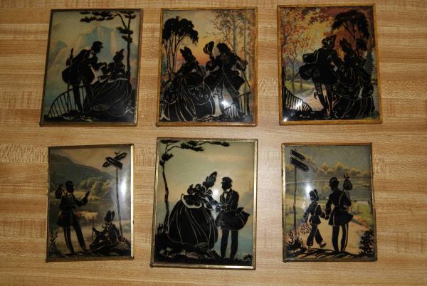 6 pictures with belveled glass. Black silhouettes painted on glass. Back ground painted with scenery to make the people look 3-D on the scenery