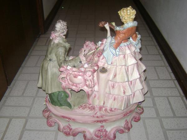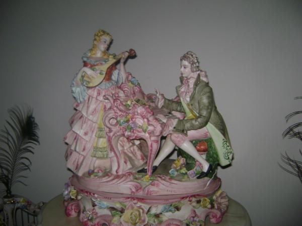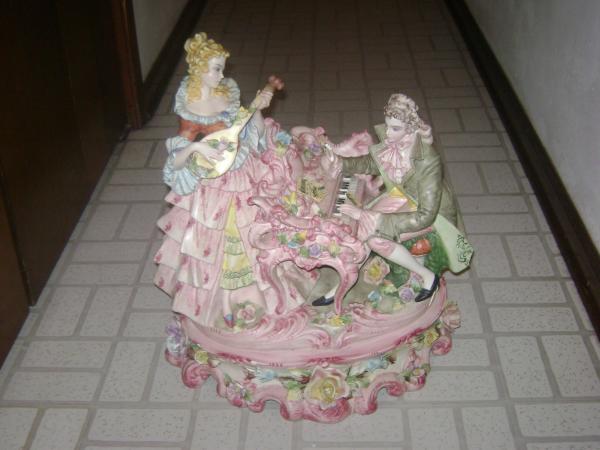 It is a porcelain Capodimonte lamp base with a man playing the harpsichord and a woman playing a lute. There is a Benrose stamp on the underneath of the lamp base that says made in Italy. There are a few chips and a crack on the right side. Please see attached pictures.