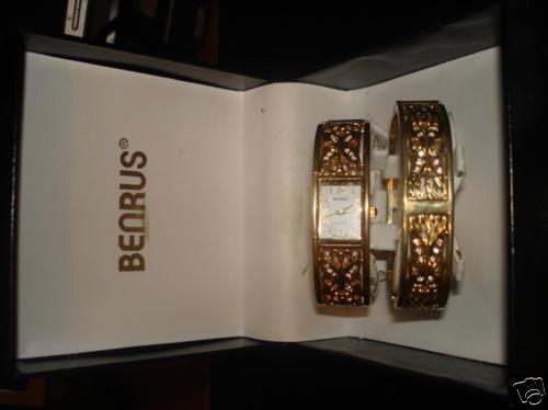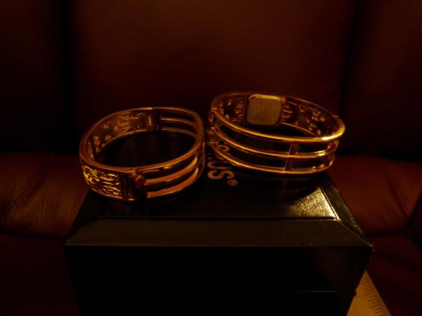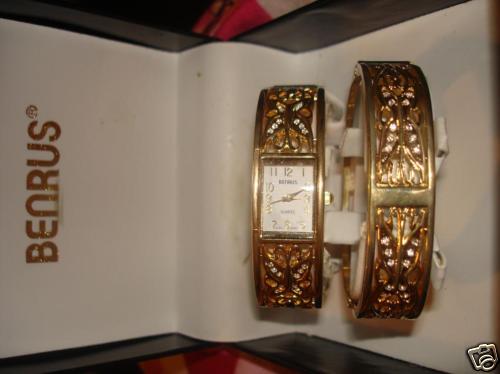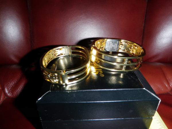 Bangle watch and bracelet, gold tone with diamond accents. 20 diamonds on watch, 20 on bracelet. It appears never to be worn and still has Poly tag QCS 4m; QC passed on back of watch. No instruction booklet. Watch is Quartz, Japanese movement. Battery is 377.