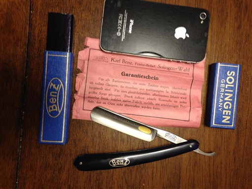 I do not know much about this razor, because there isn't too much on the internet about it. What I have gathered though is that Karl Benz (Mercedes-Benz) tried the straight razor business and failed at it. Apparently (from what I have heard) is that only 1000 pieces were made and then that business failed for him. The box is fairly mint, the instructions are a bit tattered (and in german which I cannot read unfortunately) but the blade and handle are mint. I don't believe its ever been used. I am looking for any info on this piece, and an appraisal as well. Any info is appreciated! Thanks!