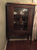 two door cabinet,glass with carved inserts, one drawer with brass handles, carved legs.arched top