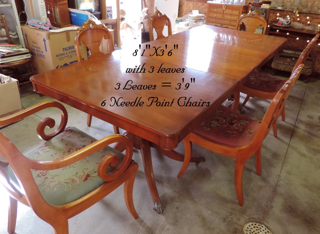 This table has 3 leaf's with it, plus 6 needle point chairs. Not sure if this table was bought with the chairs. Much of the furniture in this Estate was Maple, sonot sure if the table is too. Most we have seen in Berkey and Gay are Mahogany or Walnut. It is in excellent condition and stored for approx 30yrs.