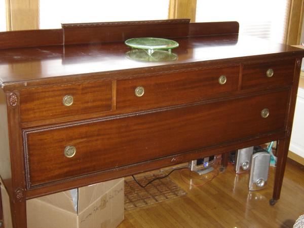 The drop leaf table (top only) has been sanded/stained & needs polyurithane, has 6 chairs - one with arms. I believe the fabric has been replaced. One chiar is missing a wood piece at the top of the back. The decor on the chairs match that on the buffett. The buffett has the lining for the little side drawers - has three drawers on top & a big long one on the bottom.