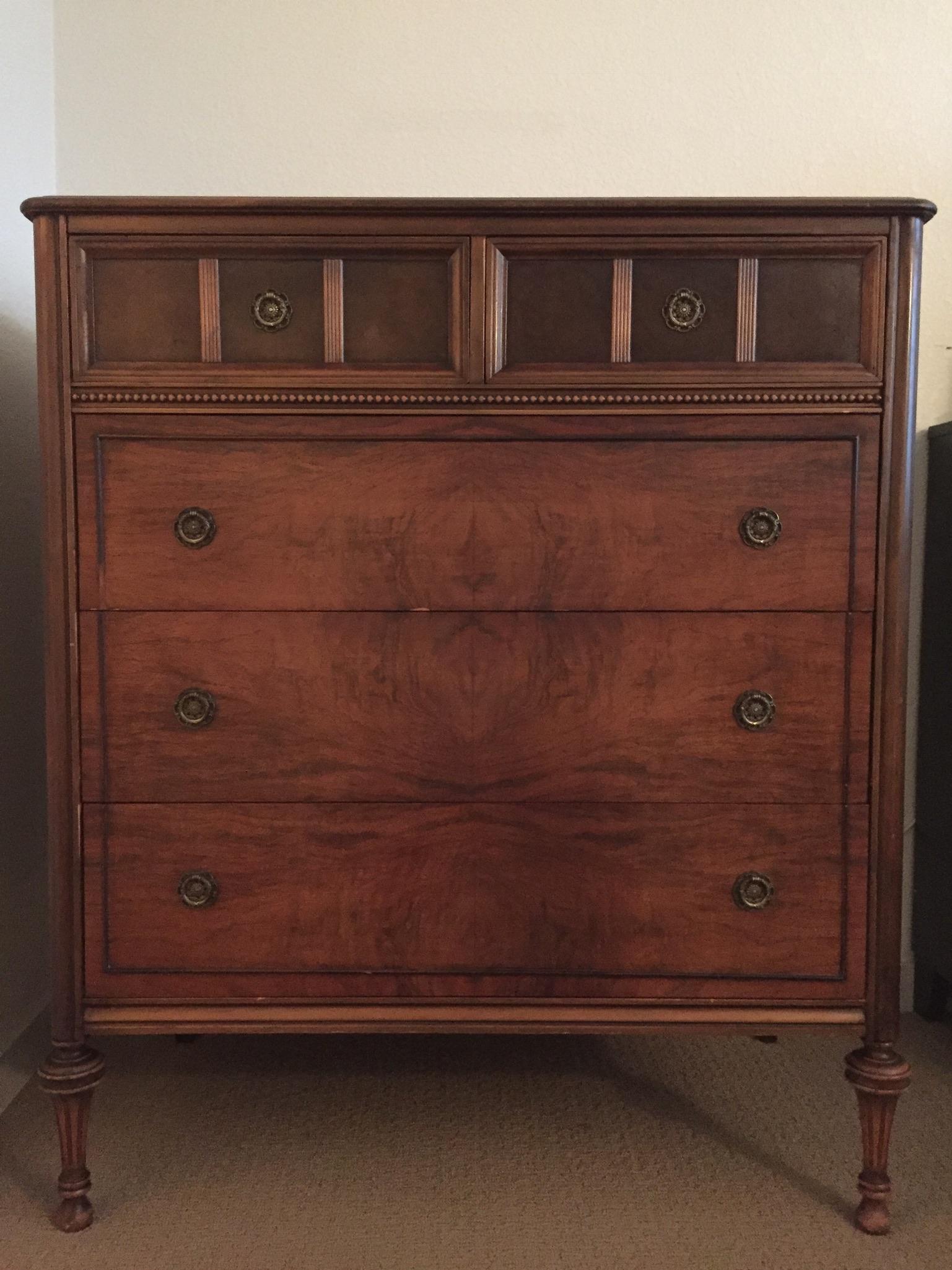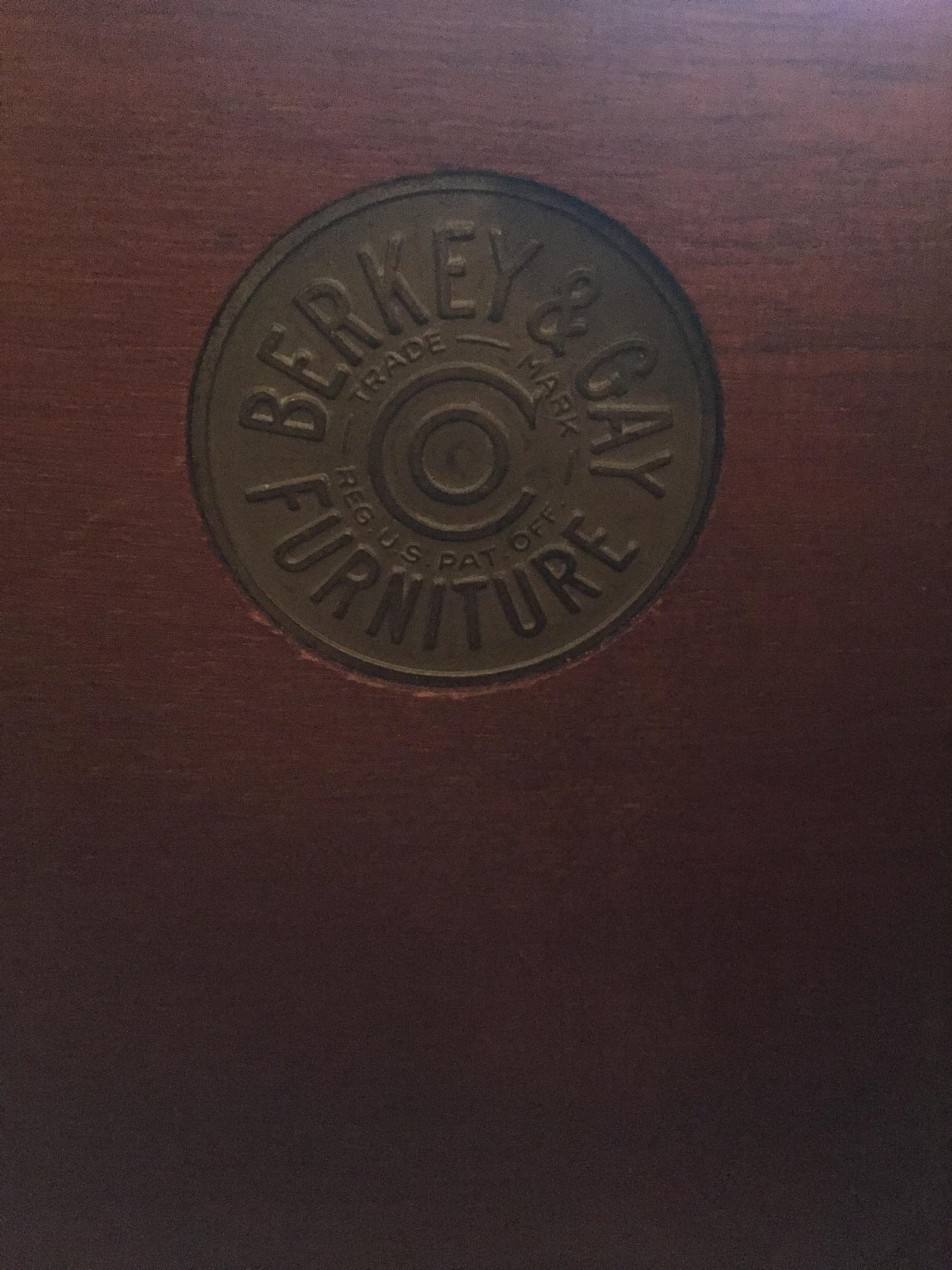 The Berkey & Gay Furniture Company was incorporated in August, 1873, and was well known for its quality suites. Dressers like this one date from the mid 1920's through early 30's and tend mix of late 18th century to early 19th Century styles such as Sheraton and Hepplewhite, generally referred to as "Federal Revival". Values for these depend a great deal on condition, as refinishing cost can exceed the value of a set in good original condition. We'd retail a comparable for about $450.00.