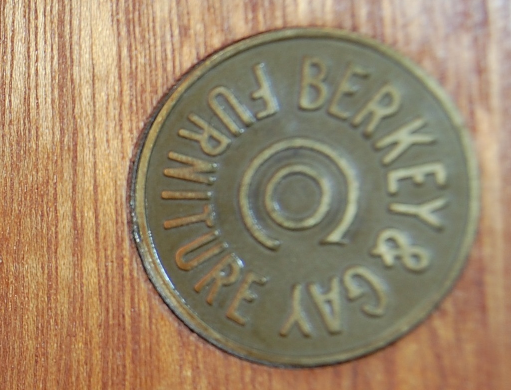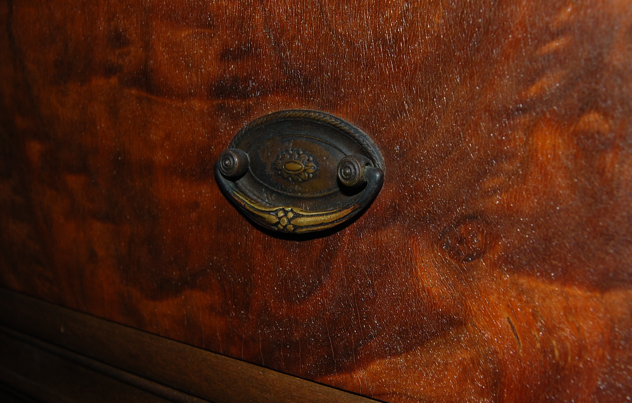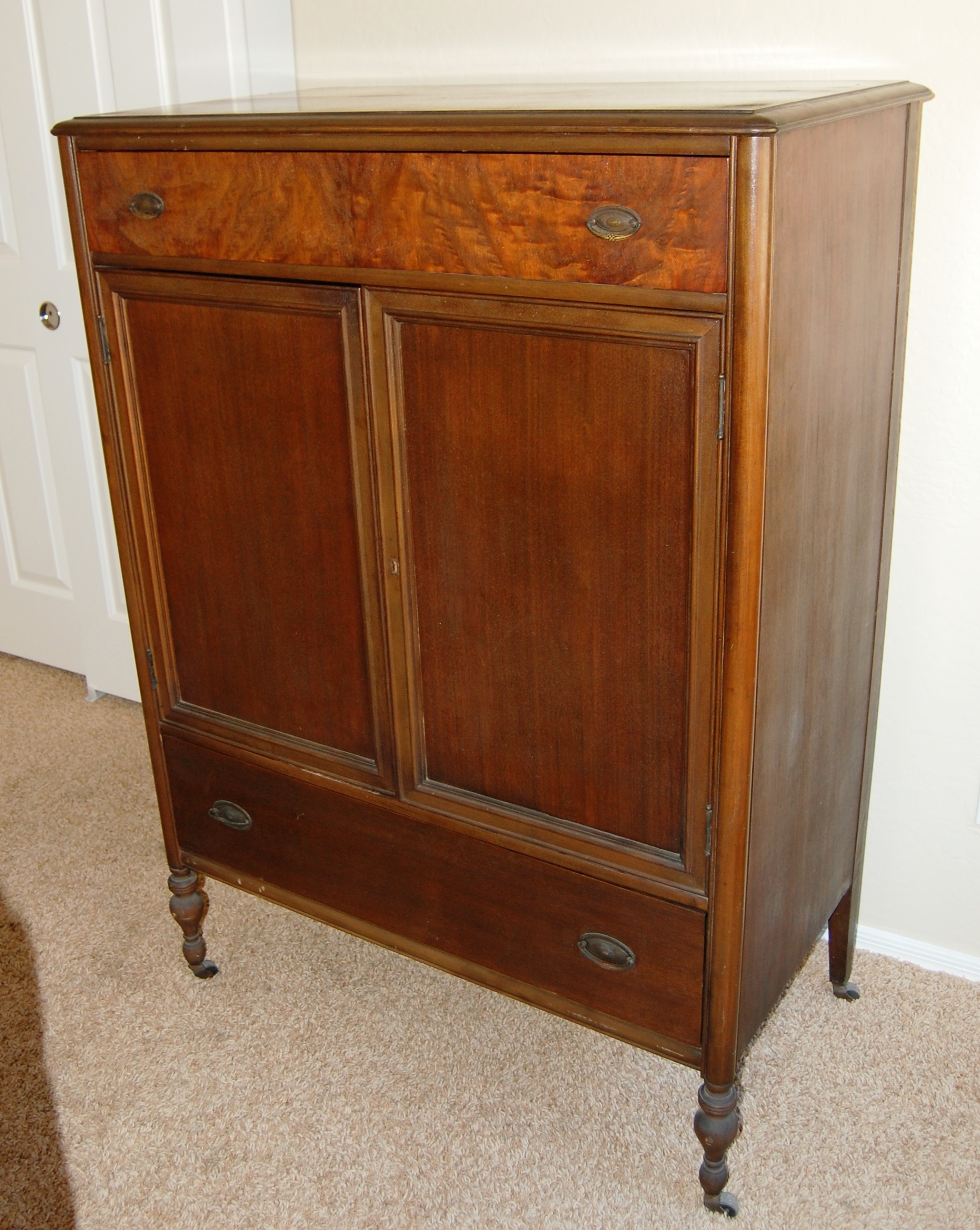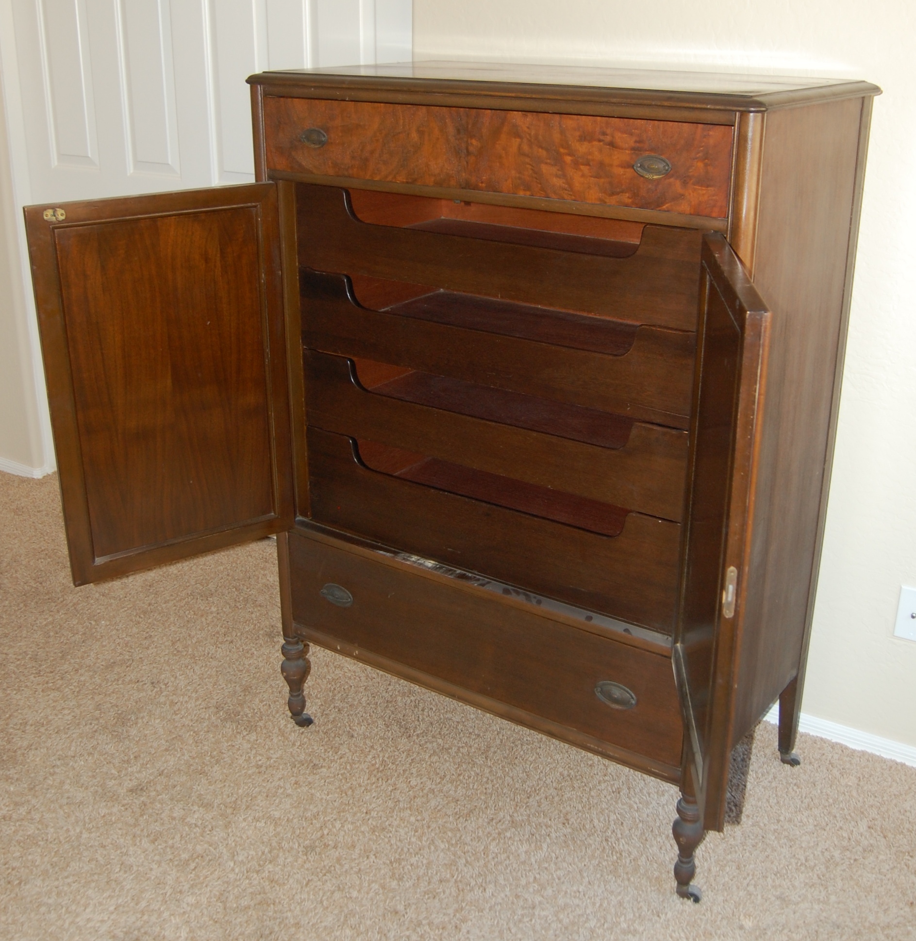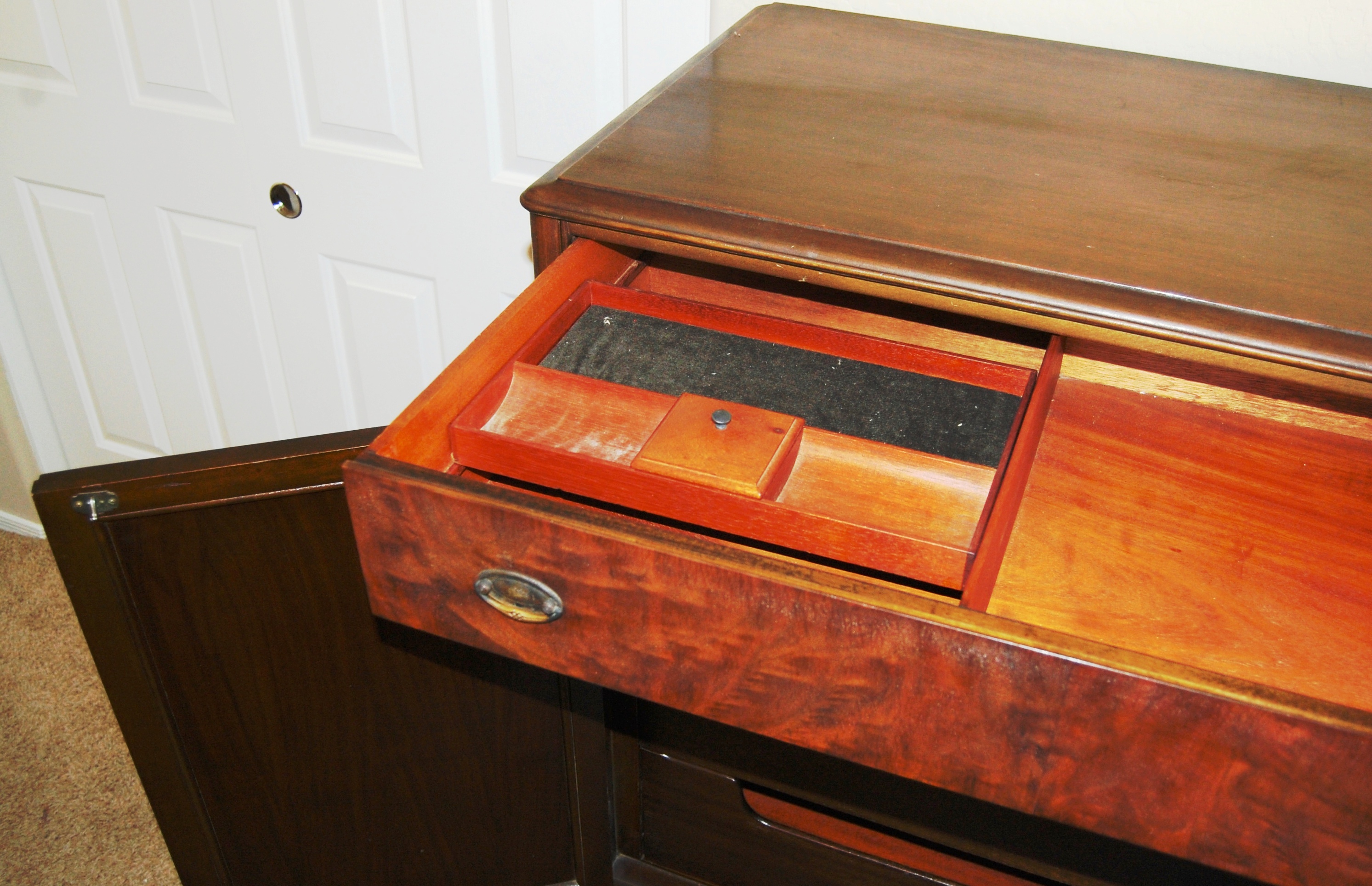 This piece is in great shape. Possibly walnut or mahogany? Four interior drawers behind doors. Top and bottom drawer. Metal casters on legs.