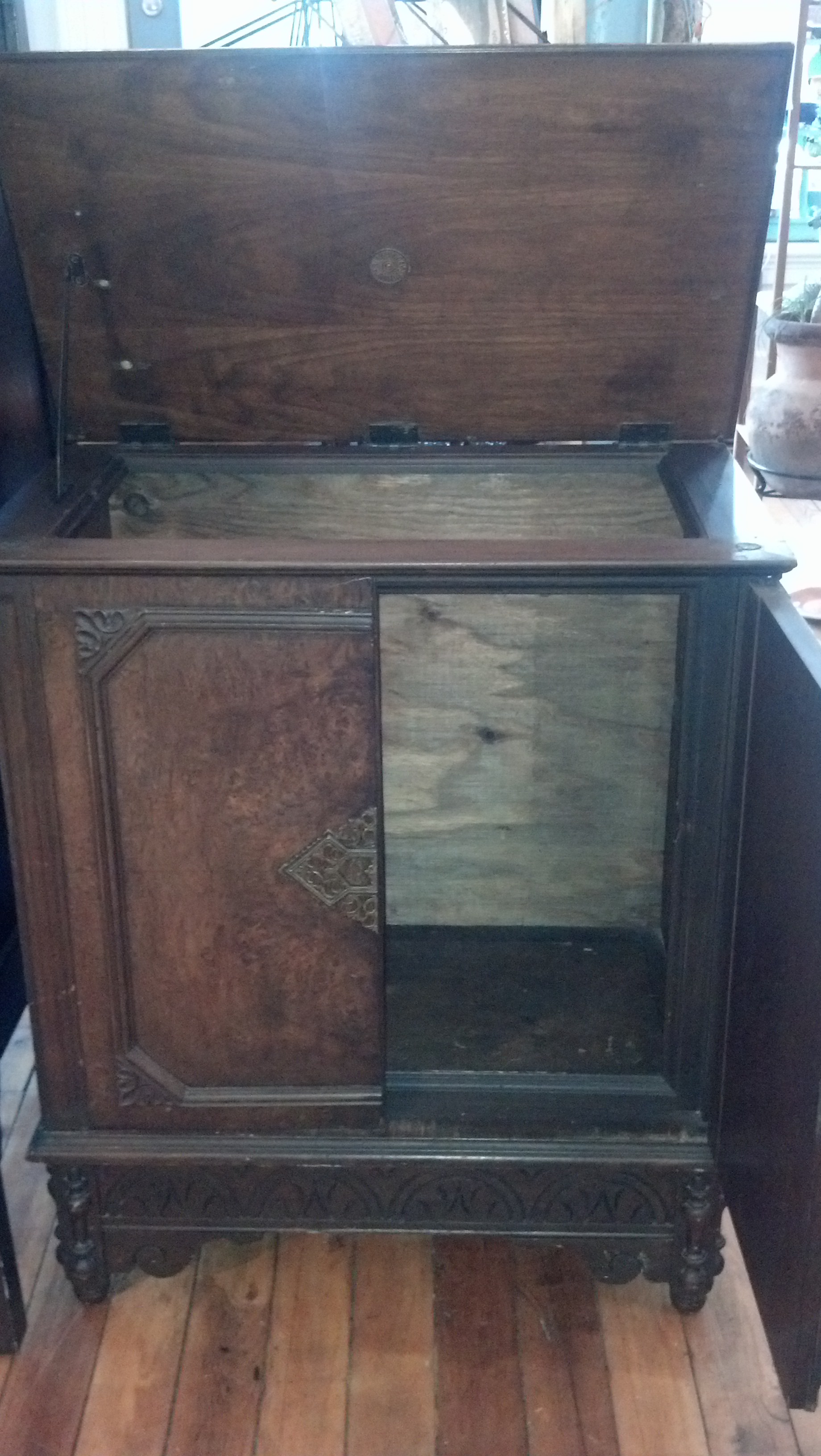 My grandfather gave me a radio cabinet. the top opens and stays up, the two front doors open and have a beautiful Iron Man decorative piece on the front the legs have a decorative piping this is all I got etched engravings on all four sides. it's in excellent condition. there's a peg on its underside but I can't read what it says.