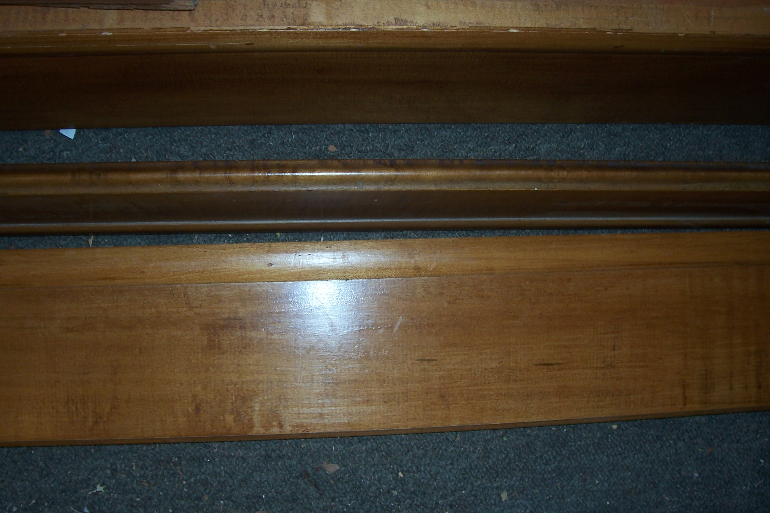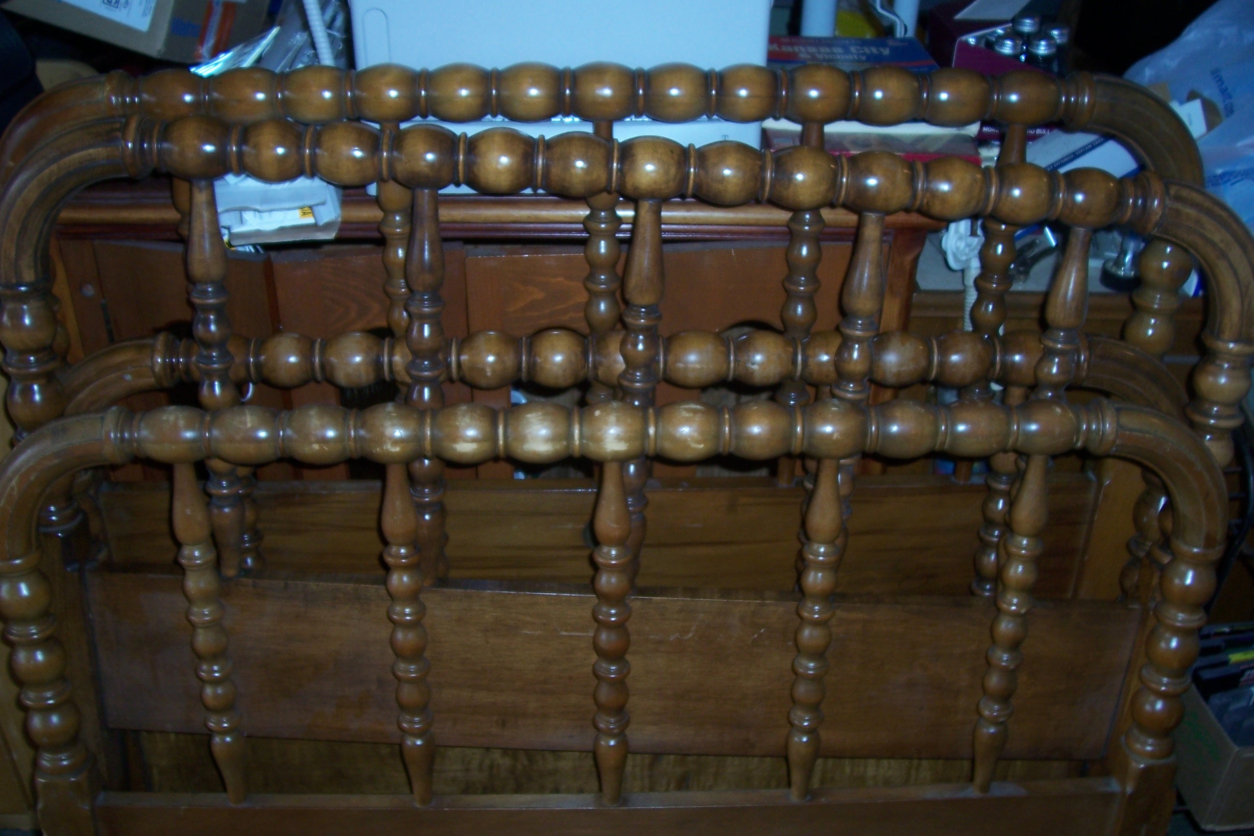 just picked up this beautiful set. it is complete with side & end rails as well as the bed slats.it is for the most part in very good condtion,however it does have a small chip & some scratches ,mostly contained to just one of the sets.it does have the brass logo on one headboard