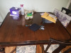 this is a mahagony bedroom suite with a 3 drawer dresser, mirror attached, a 1 drawer vanity, mirror attached and a double bed with short detailed posts