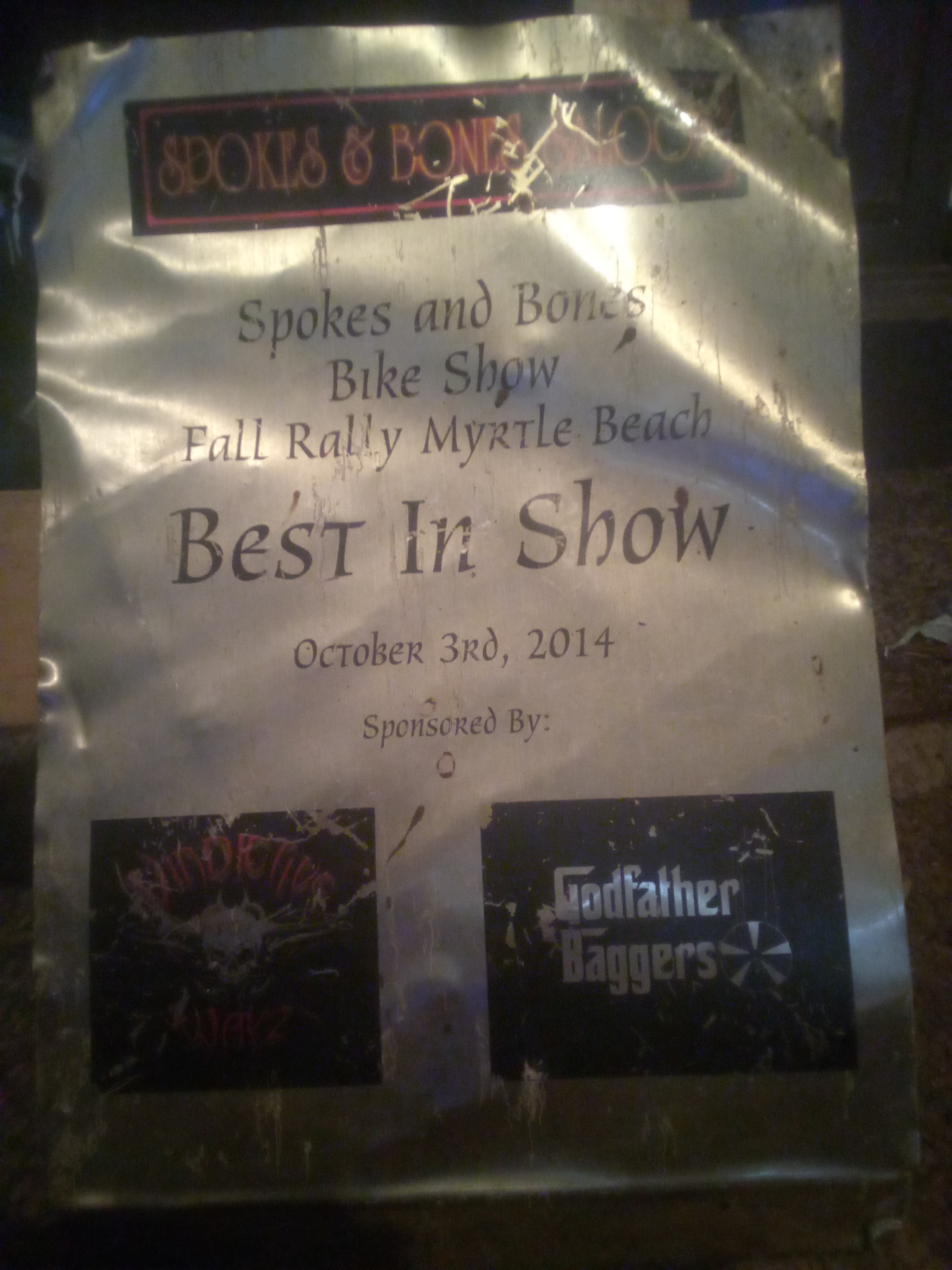 Historical Context: The award was presented at the Spokes & Bones Saloon during the Myrtle Beach Fall Rally Bike Show on October 3rd, 2014. This event is part of a larger tradition of motorcycle rallies that celebrate bike culture and community. The sponsors, Godfather Baggers and Vindictive Ways, are recognized within the motorcycle community, adding to the award's provenance.