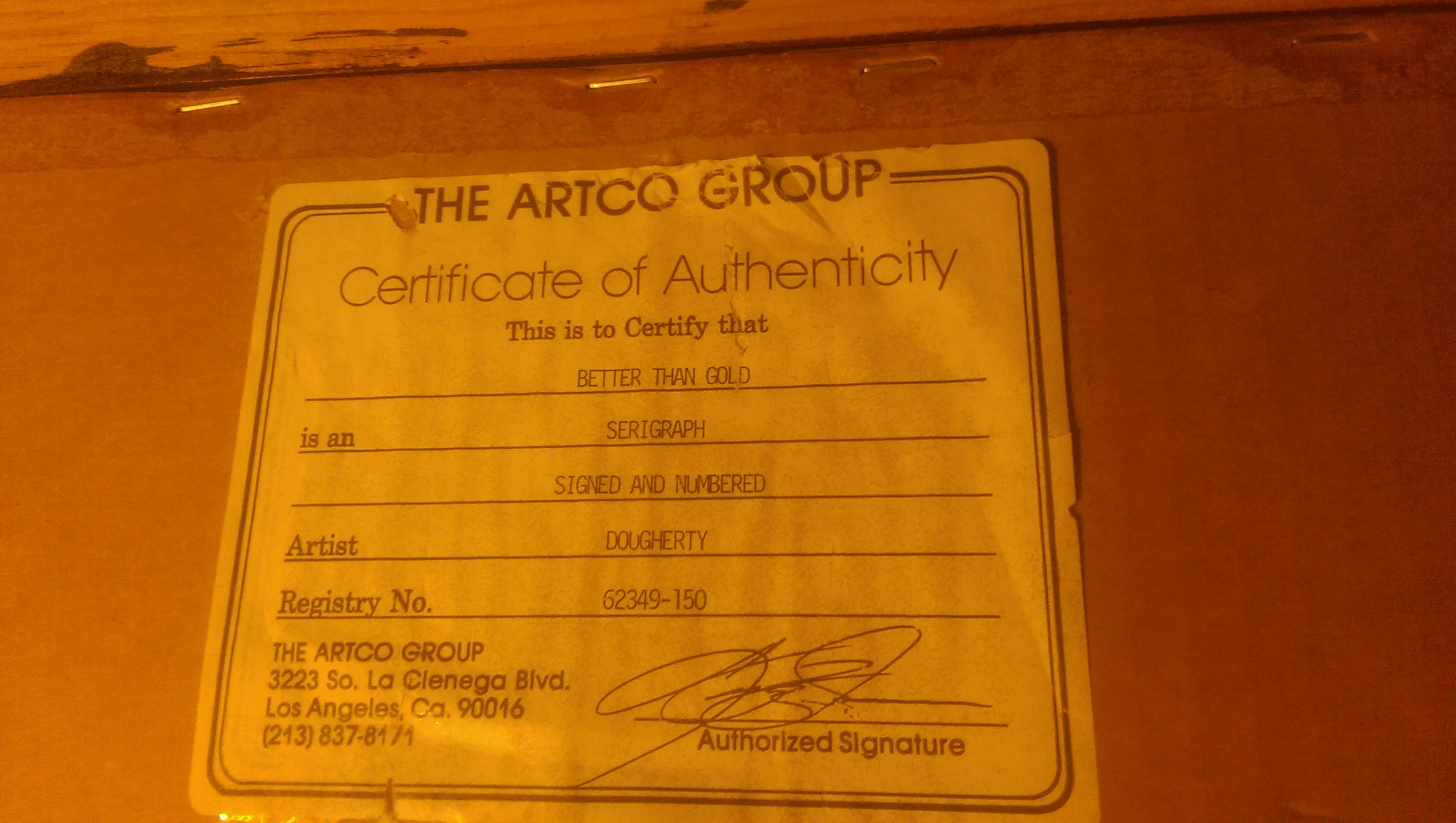 Certificate of authenticity on the back, signed, by the artco group