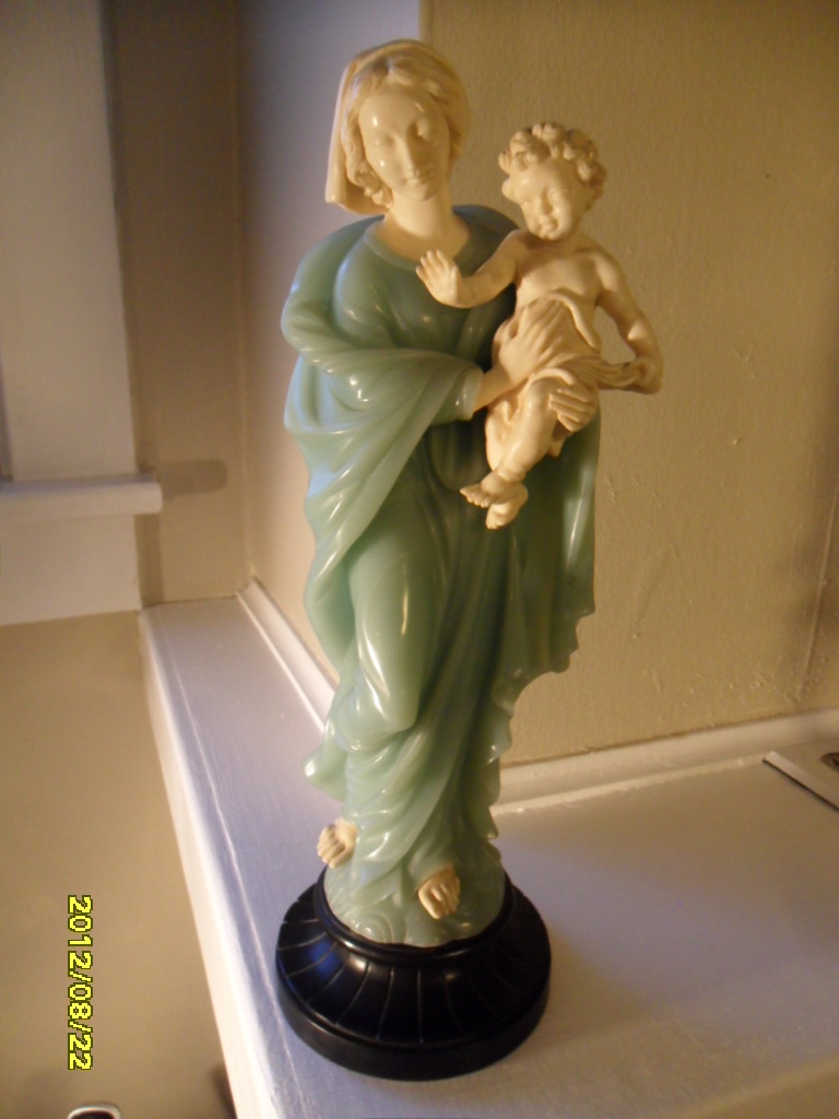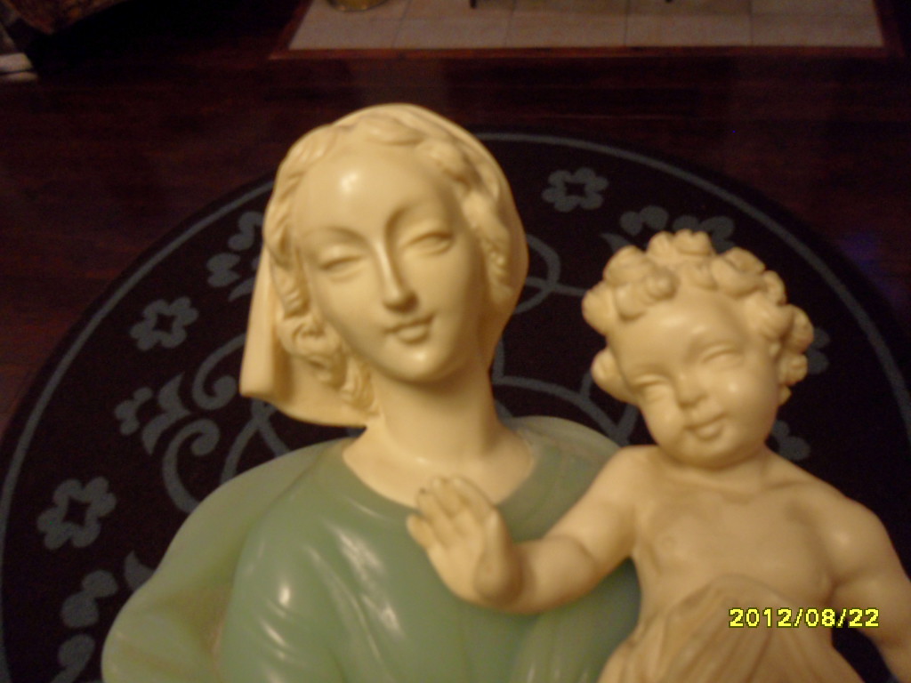 This is a rare find. a 12" Bianchi Sculpture of Madonna and child. Green Alabastrer and Ivory. Perfect condition and no discoloration. Bottom of base has sticker "BIanchi made in Italy"