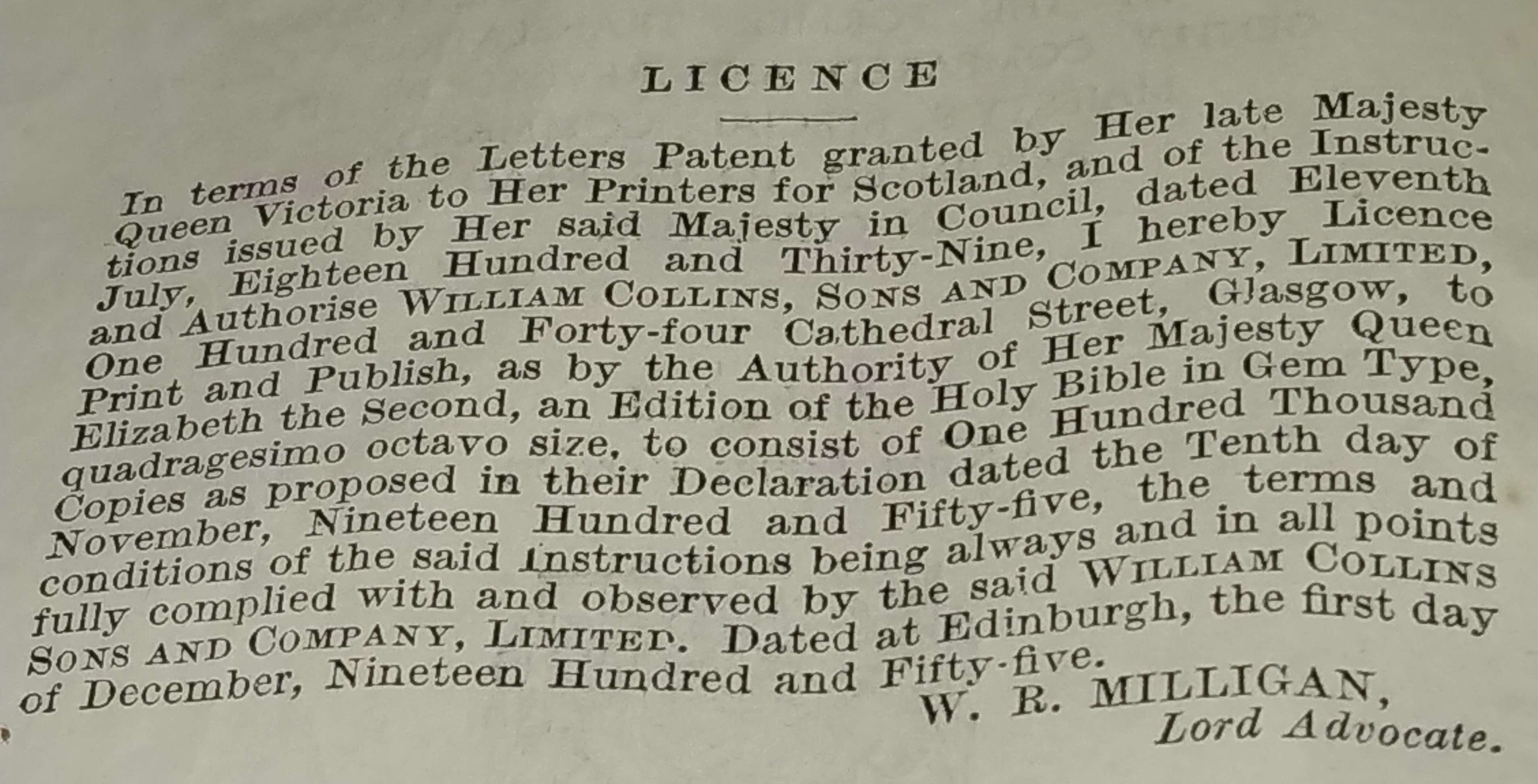 Small old and new testament queen Victoria and queen Elizabeth. Only 100,000 copies were made to use in the church. It says India paper gem type Quadragesima octavo size. W.R. Milligan Lord advocate. It says licence. In terms of the letters patent granted by her late majesty queen Victoria to her printers. 2 dates declaration datednov. 10, 1955 and dated at Edinburgh Dec. 1, 1955
