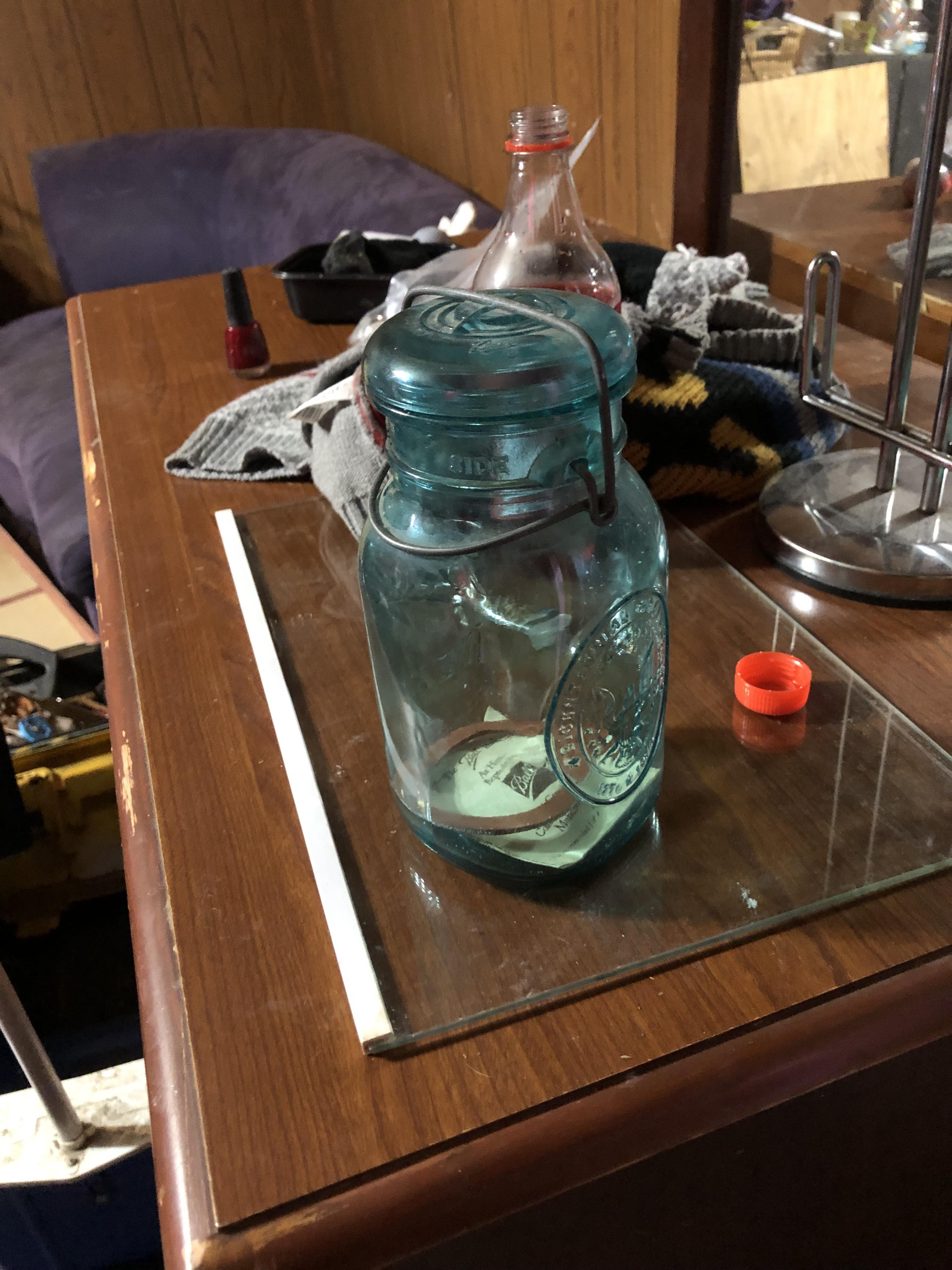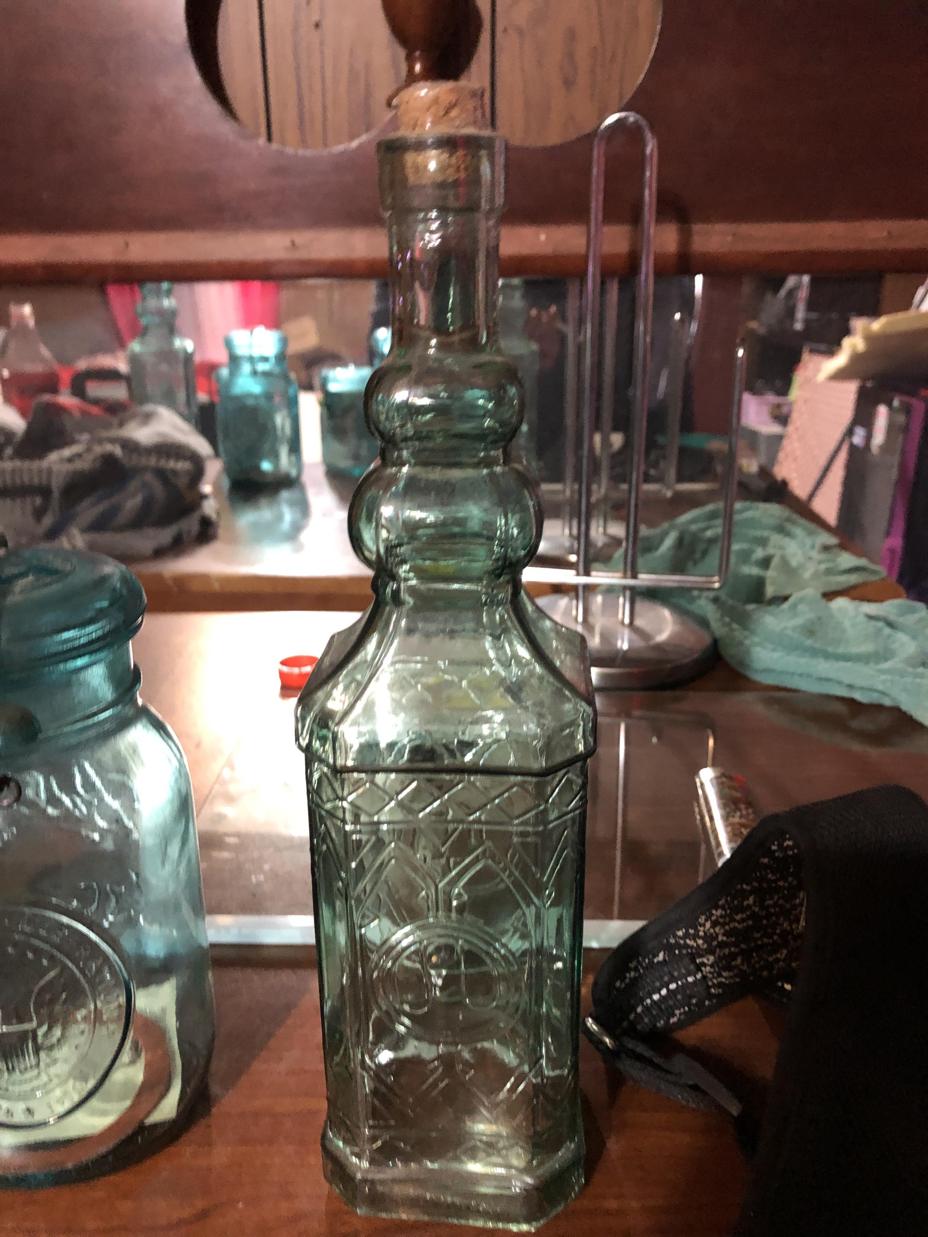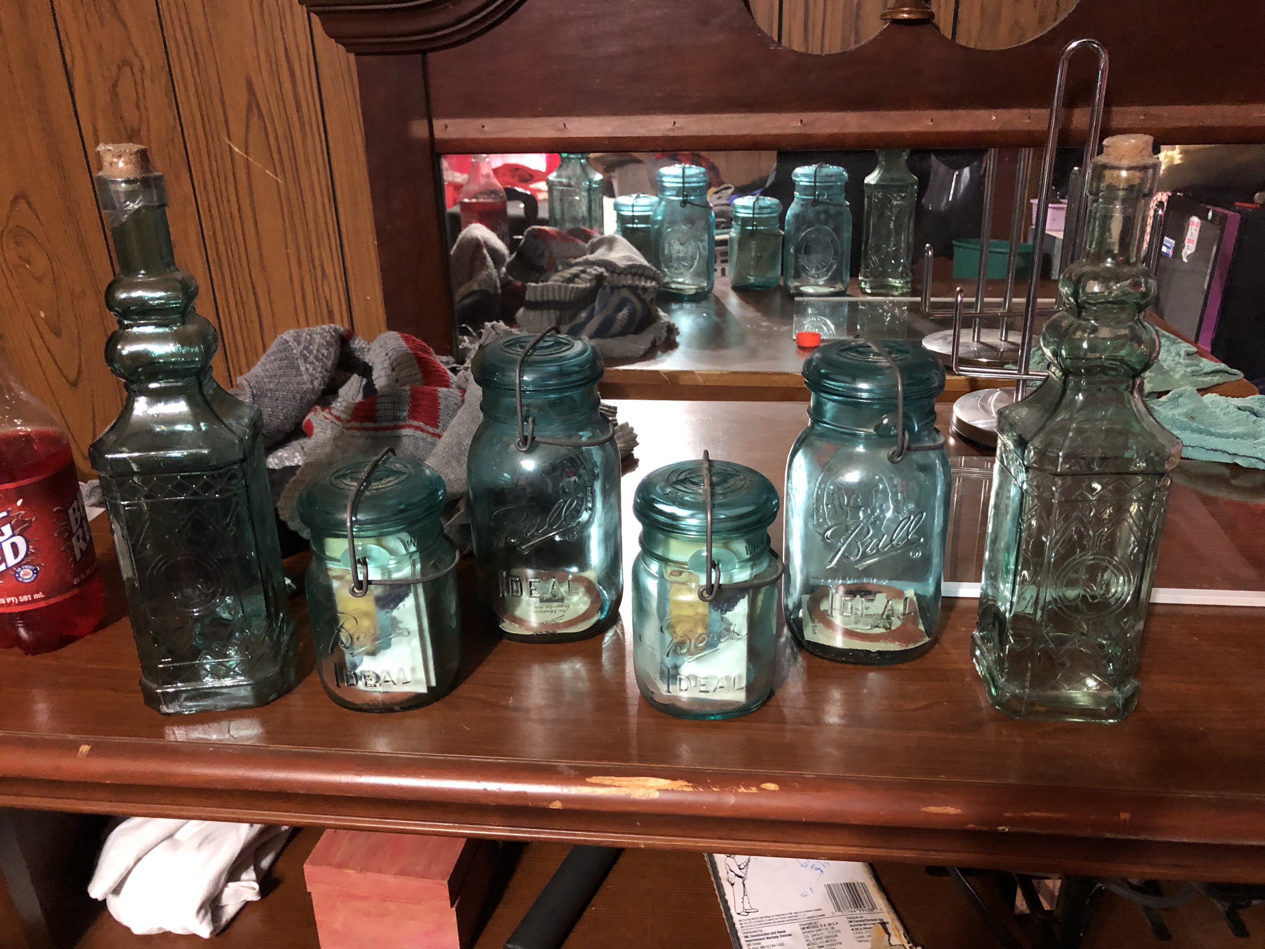 Aqua bicentennial Ball canning jar with metal top closure. 2 sizes never used still has canning paper and items inside. Also have 2 taller bottles that have a green tone to them with cork stopper plastic still sealing the cork at top.