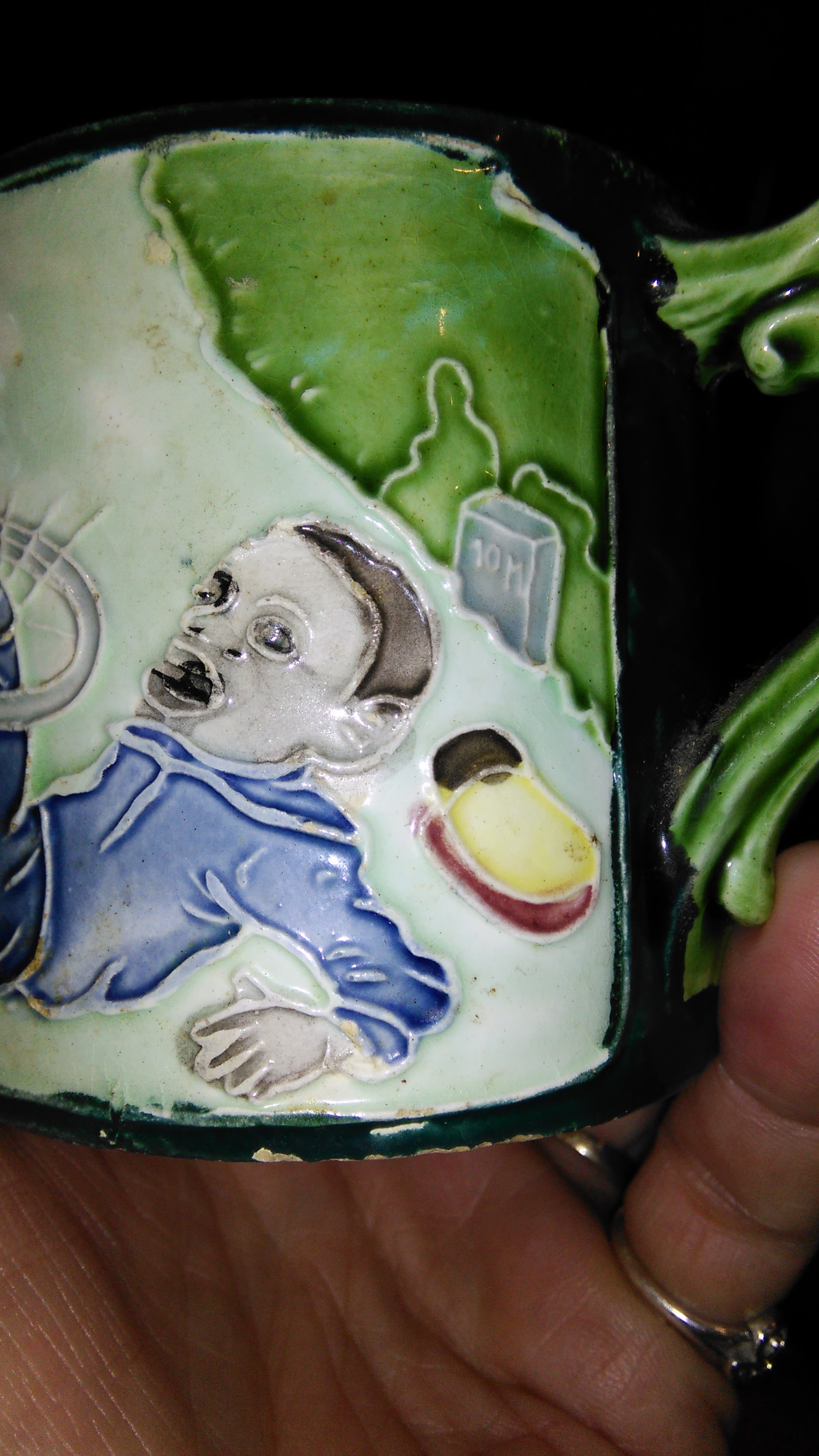 The cup has an engraved young black boy which has fallen off his bicycle . it looks as tho he has lost his sandwich ????