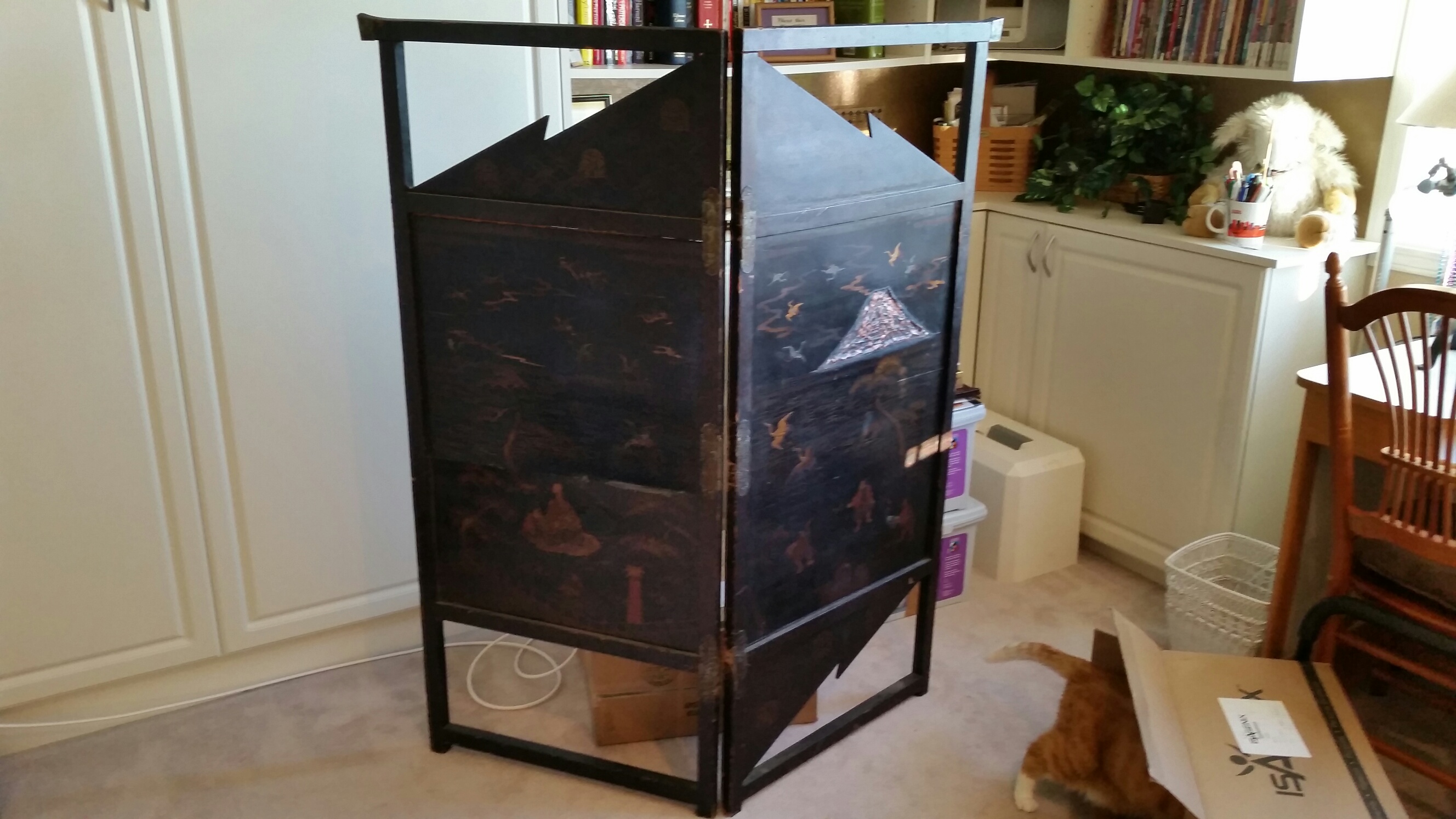 I have had this screen for more than 30 years. I know it was brought back from Japan, probably in the 1950s to 1970s.  It measures about 52" x 55". I have the missing panel at the bottom. Just haven't replaced it yet.  I have no idea of its value and am curious about it.  Any idea?
