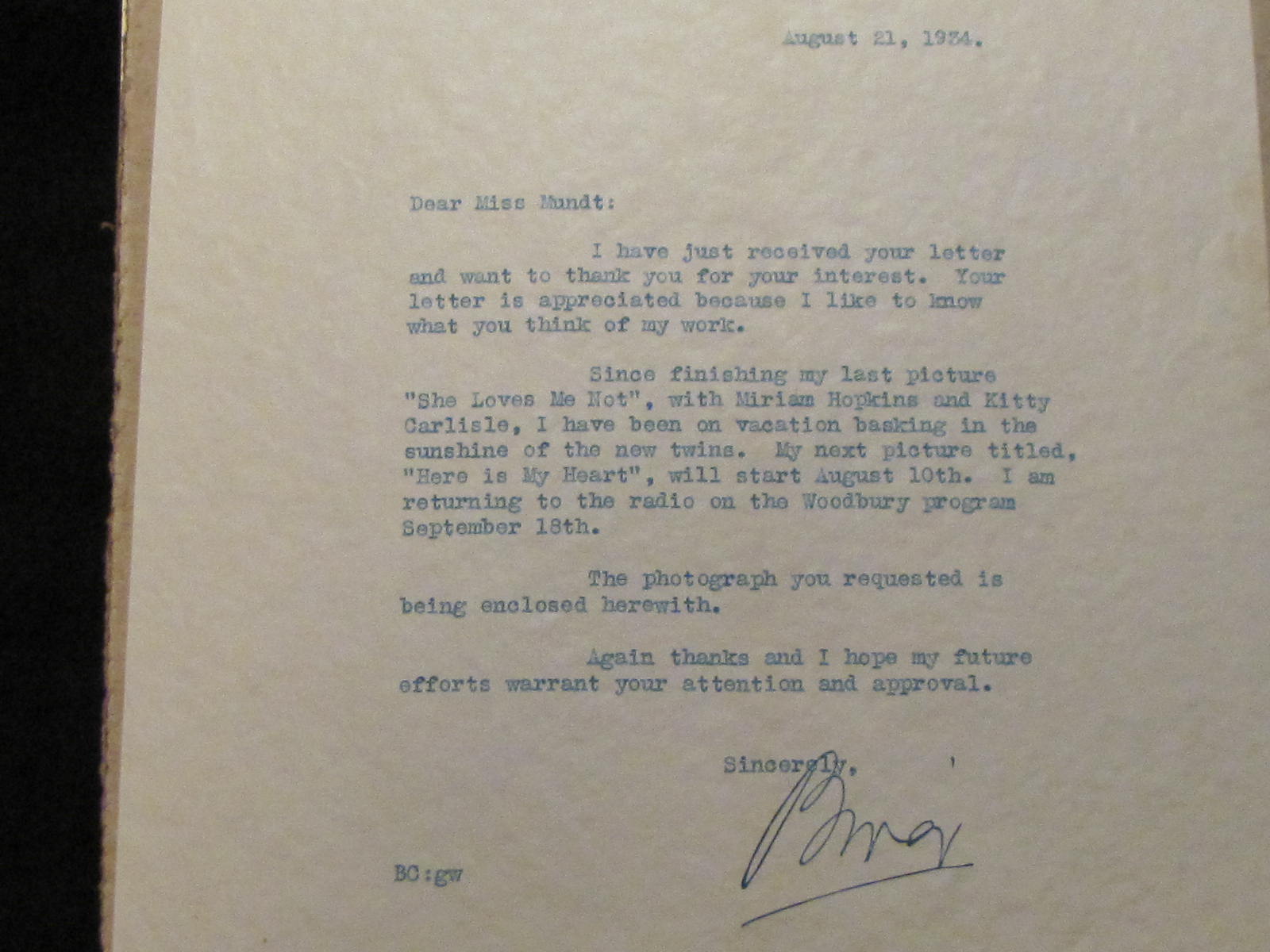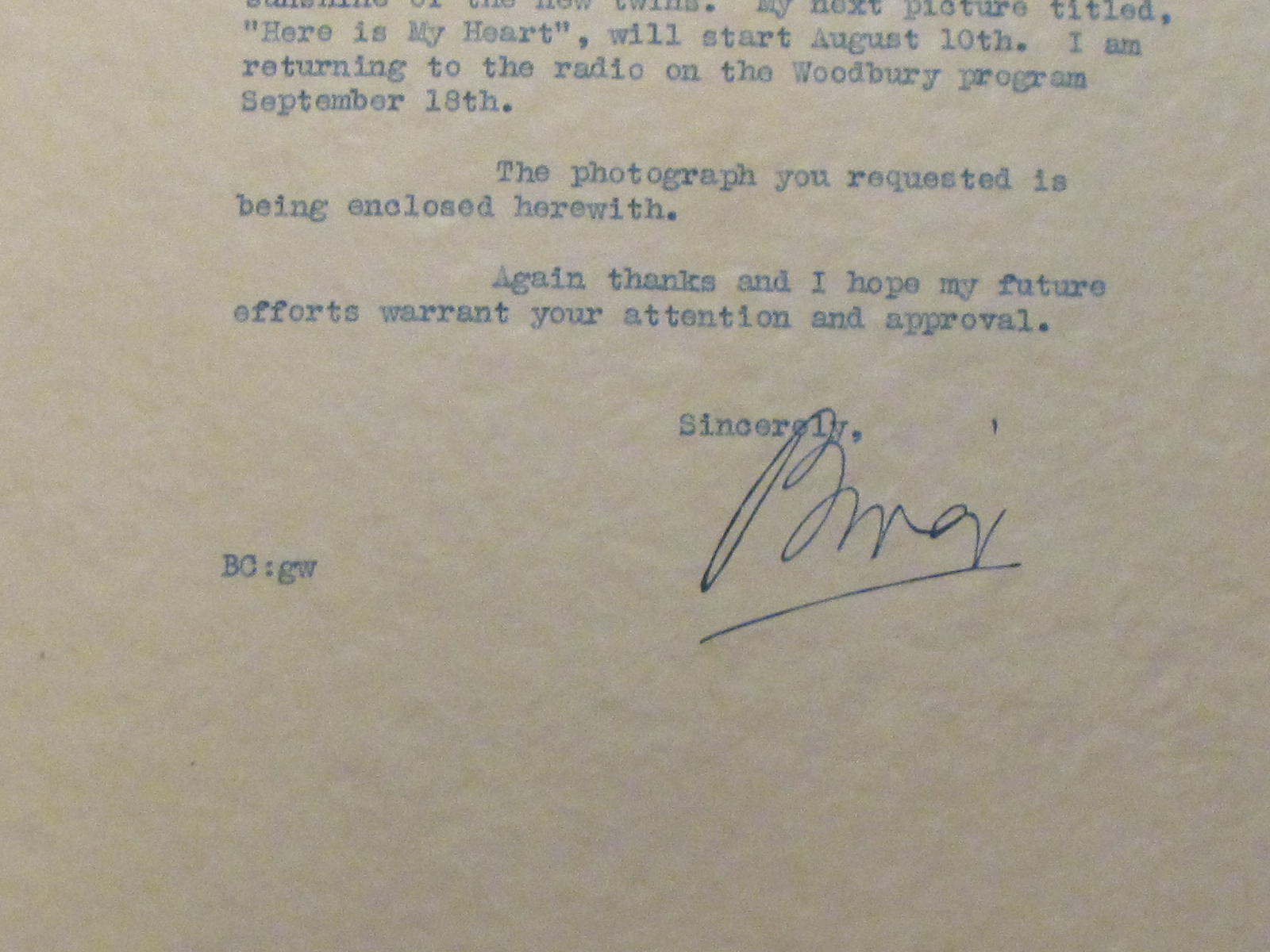 Re: Bing Crosby autographed Photo and signed letter