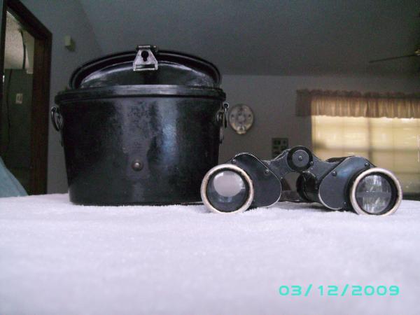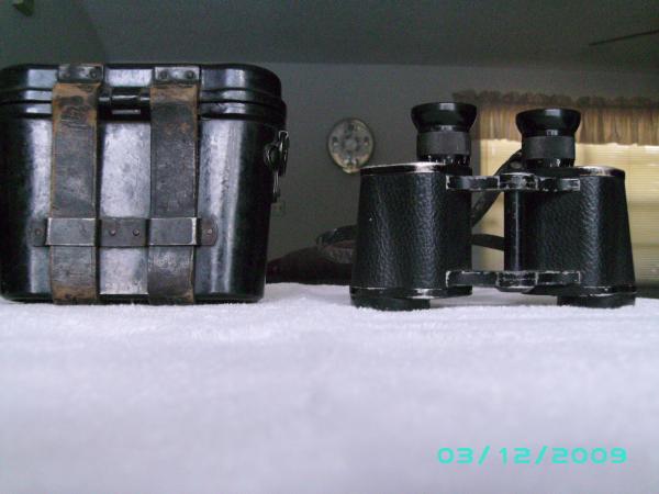 Binoculars and metal case with leather straps on both. The leather is worn, but intact. The glasses are worn, but operational. Clasp on case is spring loaded. Interior of case lid has a leather cover.