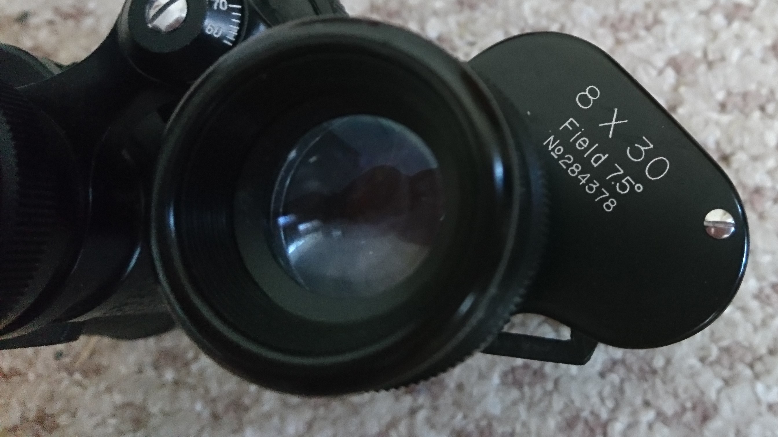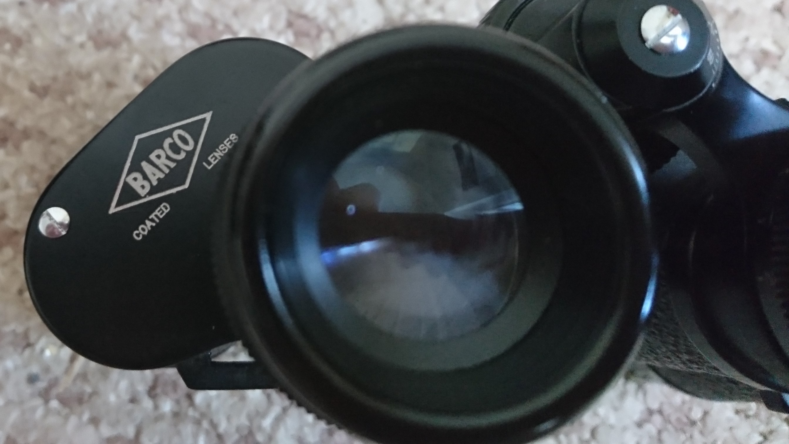 Black binoculars with the BARCO logo (coated lenses) on the side. Also say's "8 X 30 Field 7.5o No 284378".