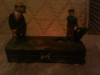 Original or replica ?? - flag is red, unmarked - golf bag ha 3 clubs which appear to have been cast as a single piece - hand painted, green - white marks on front and back (vertical bars) - emblem on front says Birdie Putt with crossed clubs and 2 golf balls - emblem is cast as part of bank and is NOT removable - bank has 4 raised "feet" (1 at each corner) to elevate slightly - rubber plug in bottm hole - hex head (with phillips also/can use either to remove bottom plate)- golfer has tan cap and vest over white shirt with red trim on black jacket-shoes black with red gaiters, club silver - pants tan like cap and vest