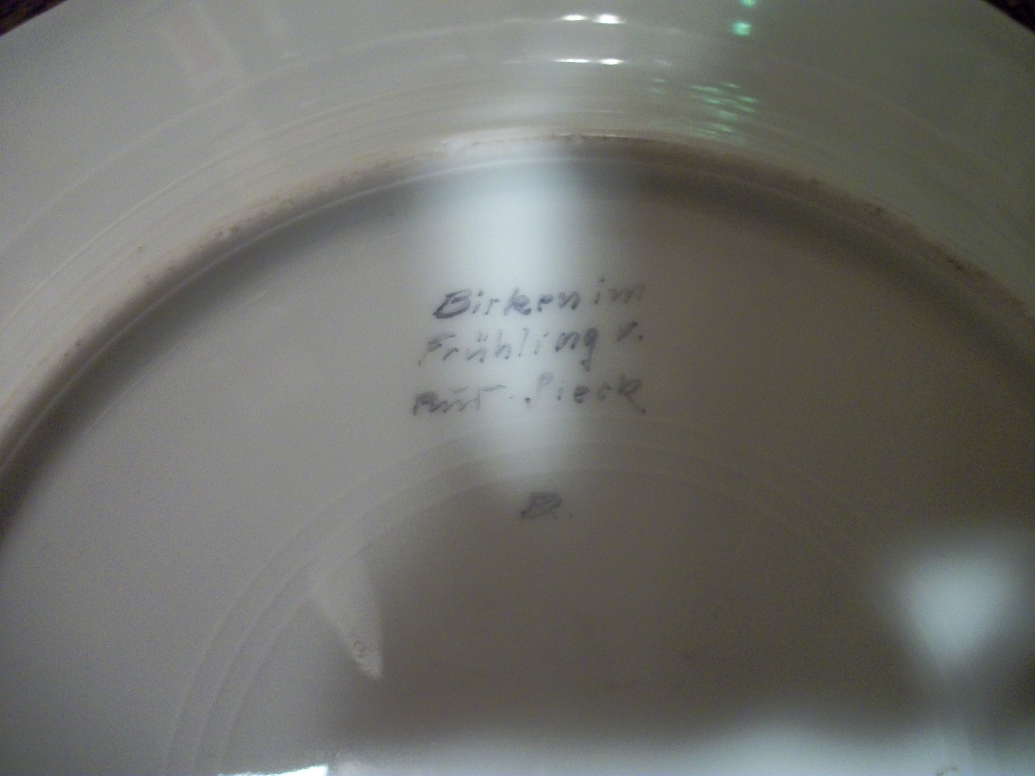 The plate has Nymphenburg on the back of it The mark looks to be stamp The mark is some kind of shild with a crown over it and it is in green The words Birleen im Fruhling is at top with "print pieck" under that and on the bottom is "O.L" The front looks to be a wood sean with gold as a border
