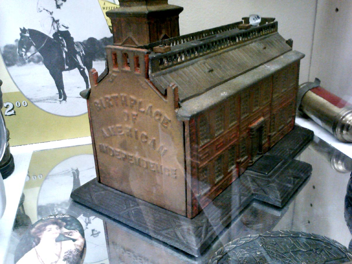 BIRTHPLACE OF AMERICAN INDEPENDENCE Centenial commeritive still coin bank of cast metal.