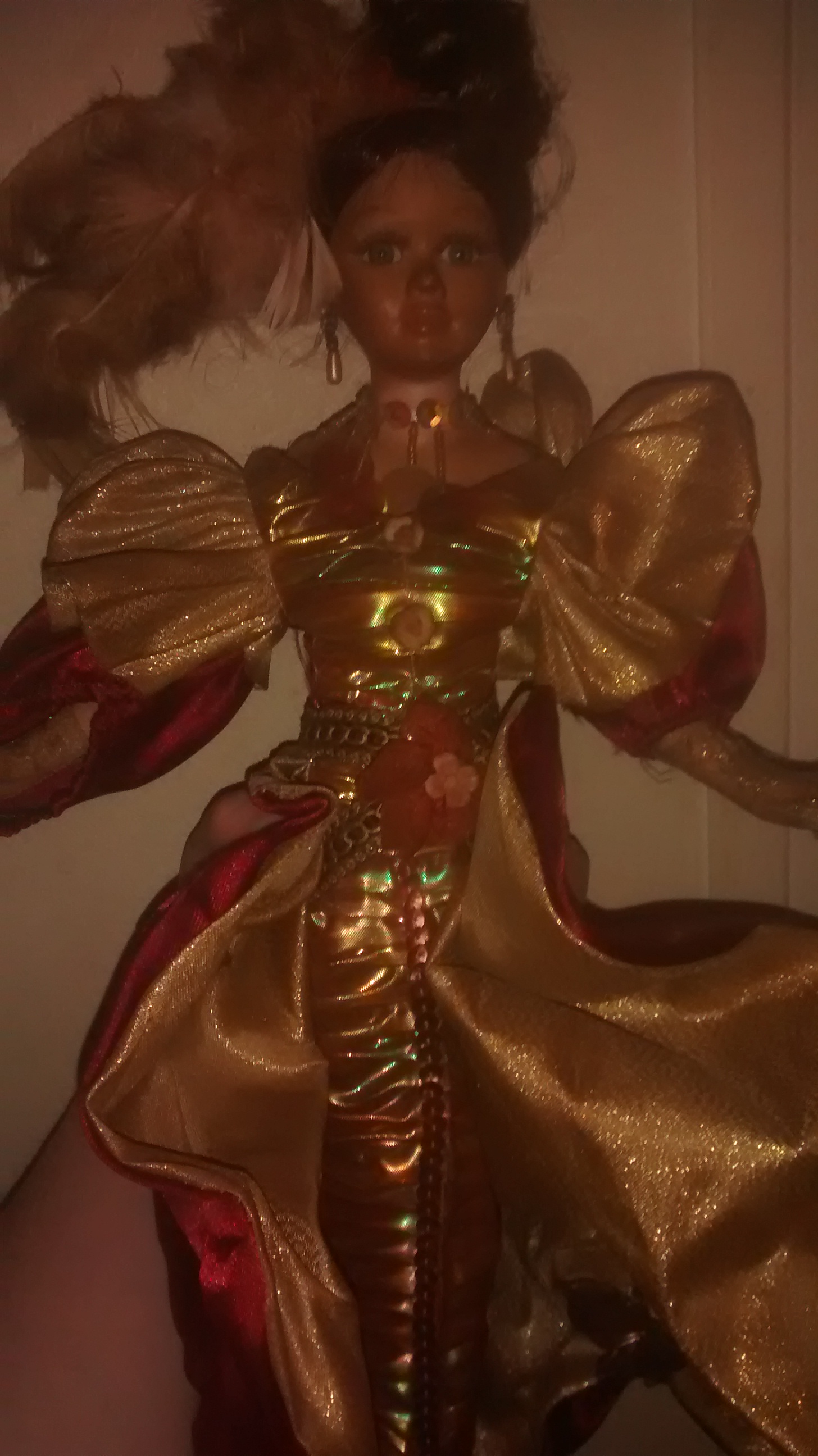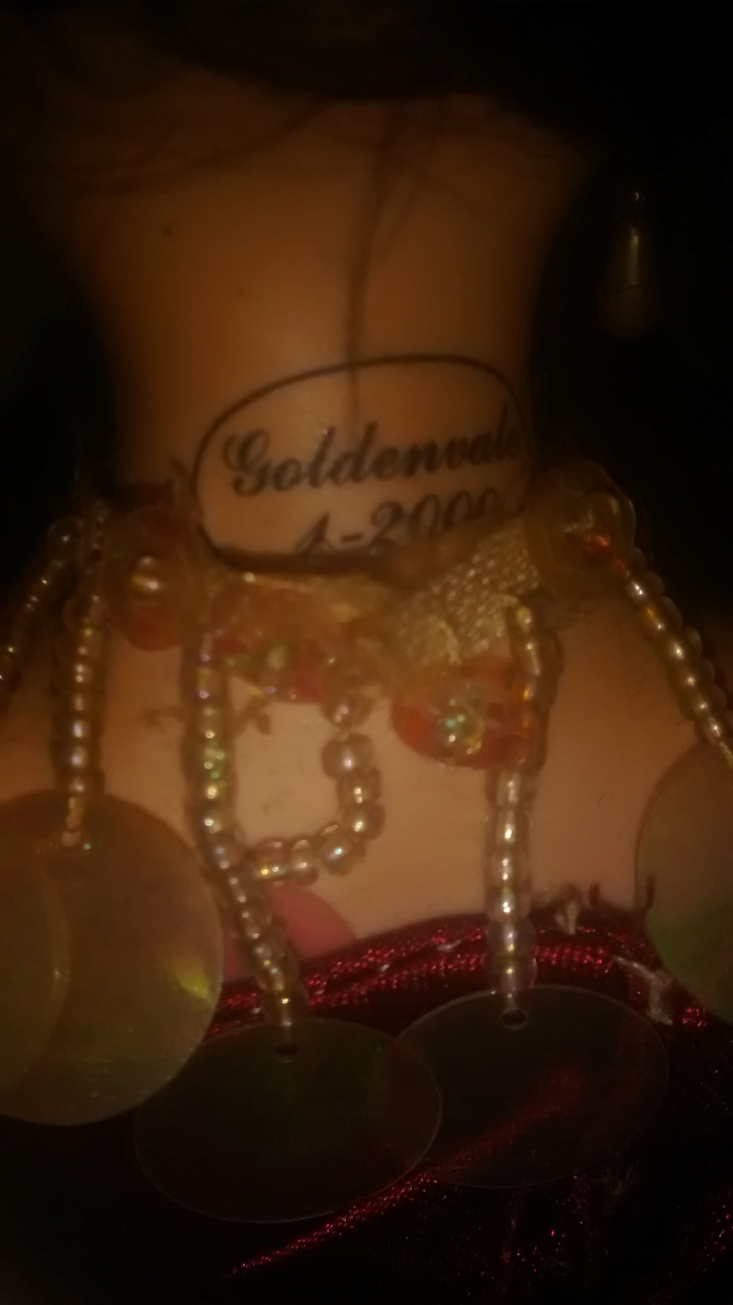 I just received this doll, it was in a shadowbox frame and has no certificate or anything so I would really like to know her name. So far all I know is she has the Goldenvale and 1-2000 on the back of her neck. Her arms, neck, head and legs are ceramic and her abdomen is stuffed fabric. She has a very interesting dress of gold and burgundy exterior. Feathers in her hair and golden lace gloves. She has brown hair in a bun style and real eyelashes. I have scoured the internet and can't find her anywhere. Can someone please help me give my new doll her name back? And also be nice to know how old she is. Thanks so very much in advance.