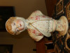 This is a bisque porcelain ceramic type bust on a pedistal.....was told it might be made in Italy or France and it's from late 1800's early 1900's. Can't tell if it's a child or not. Can't tell whether it's male or female. It's wearing grey shirt, with yellowish hair and blue hat. It is indented on the back with number 85, up inside bottom has a letter S indented then the letter MF in a square indented. I am trying to find out age, maker, what it's worth if anything.