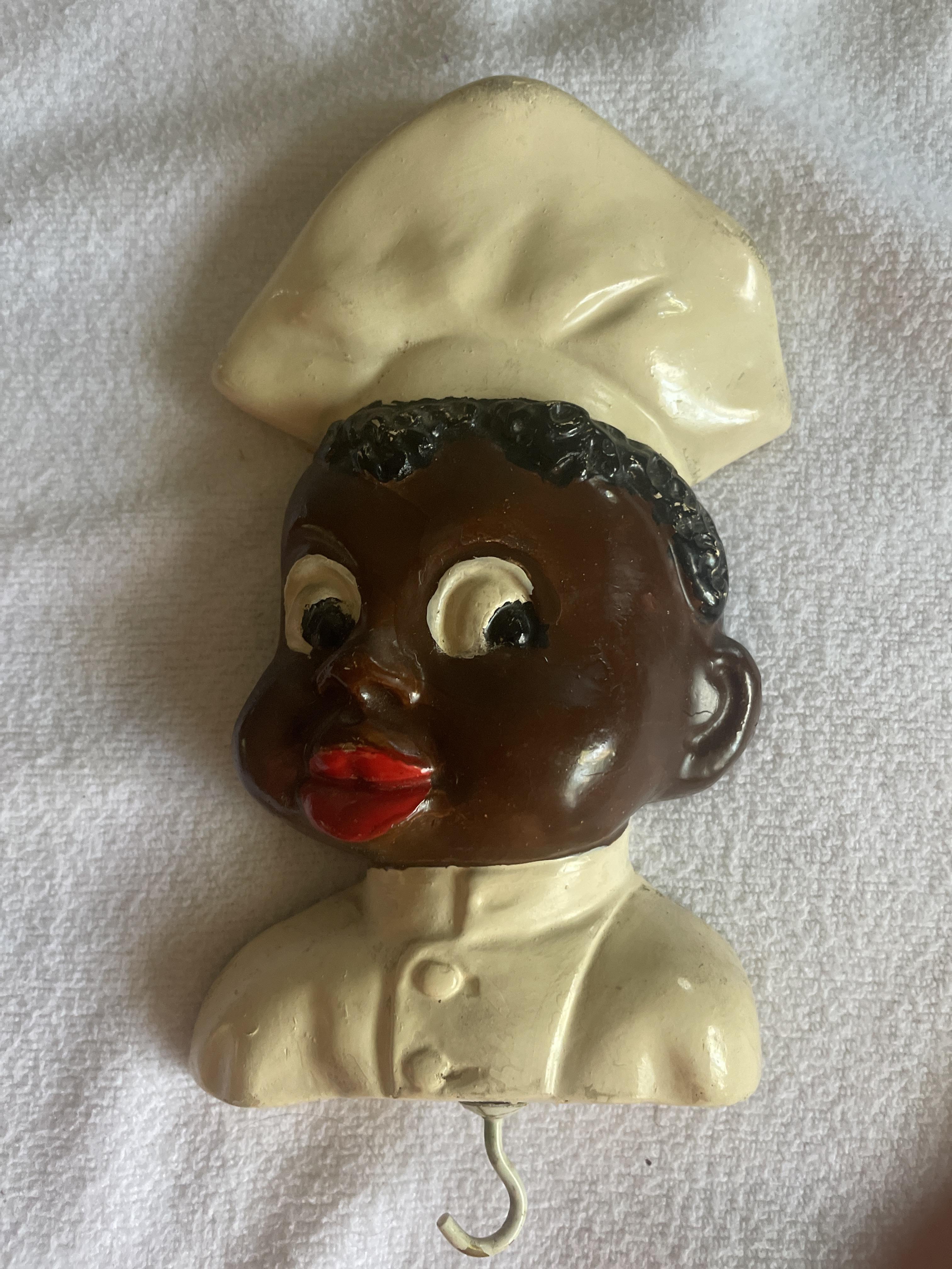 A pair of handpainted wall hangings, each with a single hook. The Female is a mammy caricature, the male is a young cook caricature. Small hangers on the back.