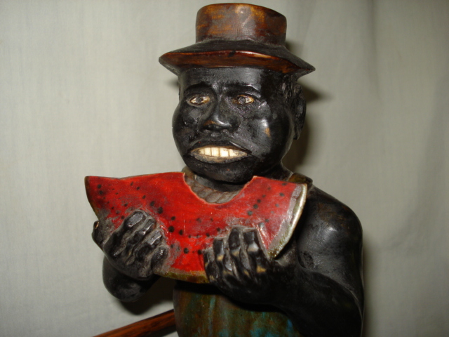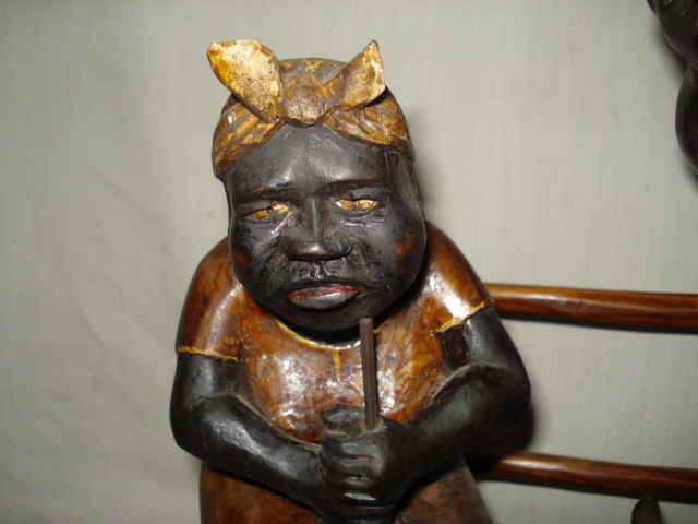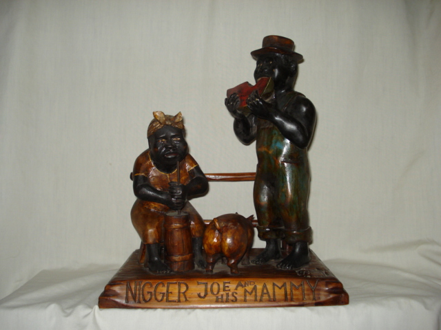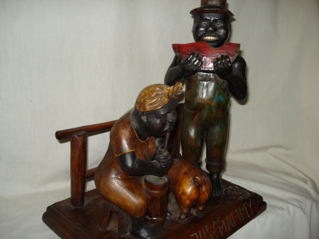 This is a hand carved Americana piece entitled 'NIGGER JOE AND HIS MAMMY". Extremely well done with alot of detail. Signed R S 1908...bottom of the base reads Philadelphia Tobaggan C Special Advertising. It measures approx 12"w X 8"d X 14"t. I don't know anything esle about this except that my brother in law bought it some where in Canada years ago. Would be nice to find out some info on it.