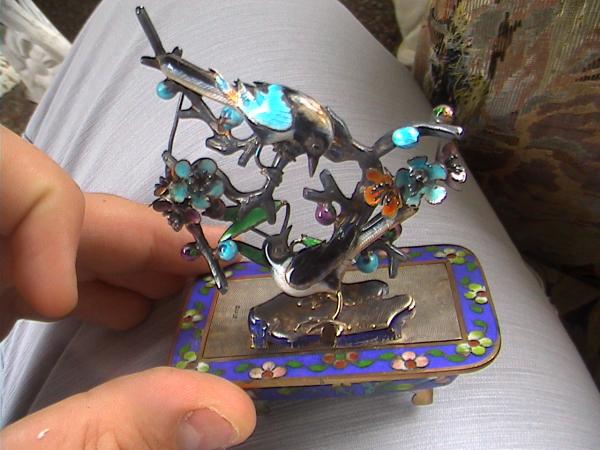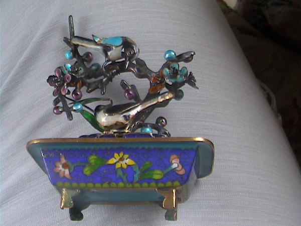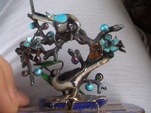 The item consists of two birds (one black and one blue) sitting on a branch with flowers. The two bird on flowers stand on a flower-decorated box with legs. (Refer to the photos attached)