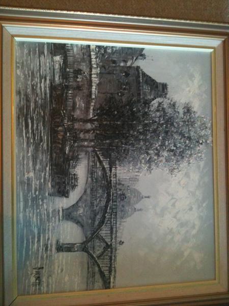 This painting is a black and white oil painting, by an artist I only know as Burnett (see image of the signature). The paiting looks as if the knife technique was used (but I'm not 100% sure of this). The picture is of buildings in the background with a prominent tree and bridge over water.