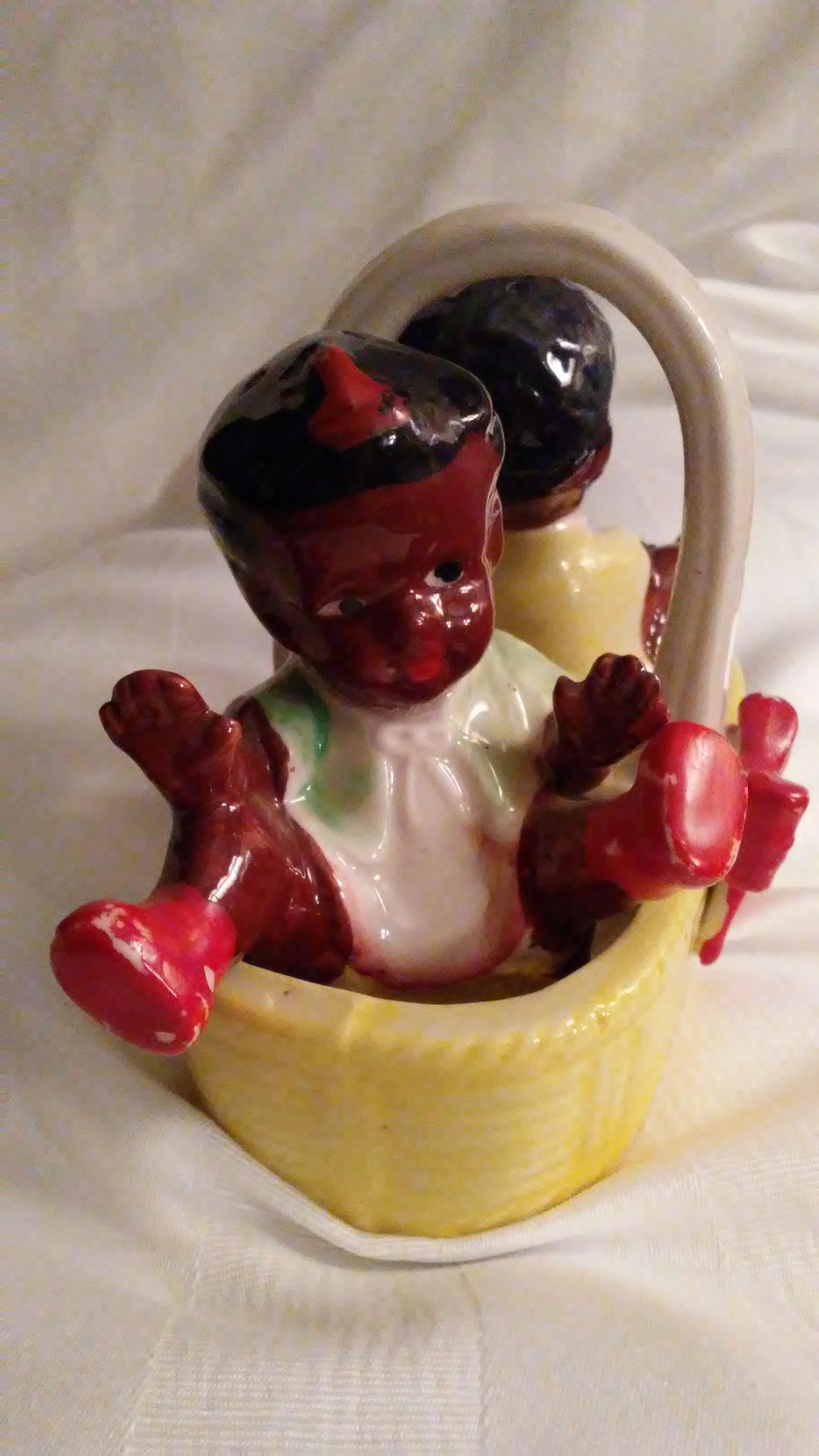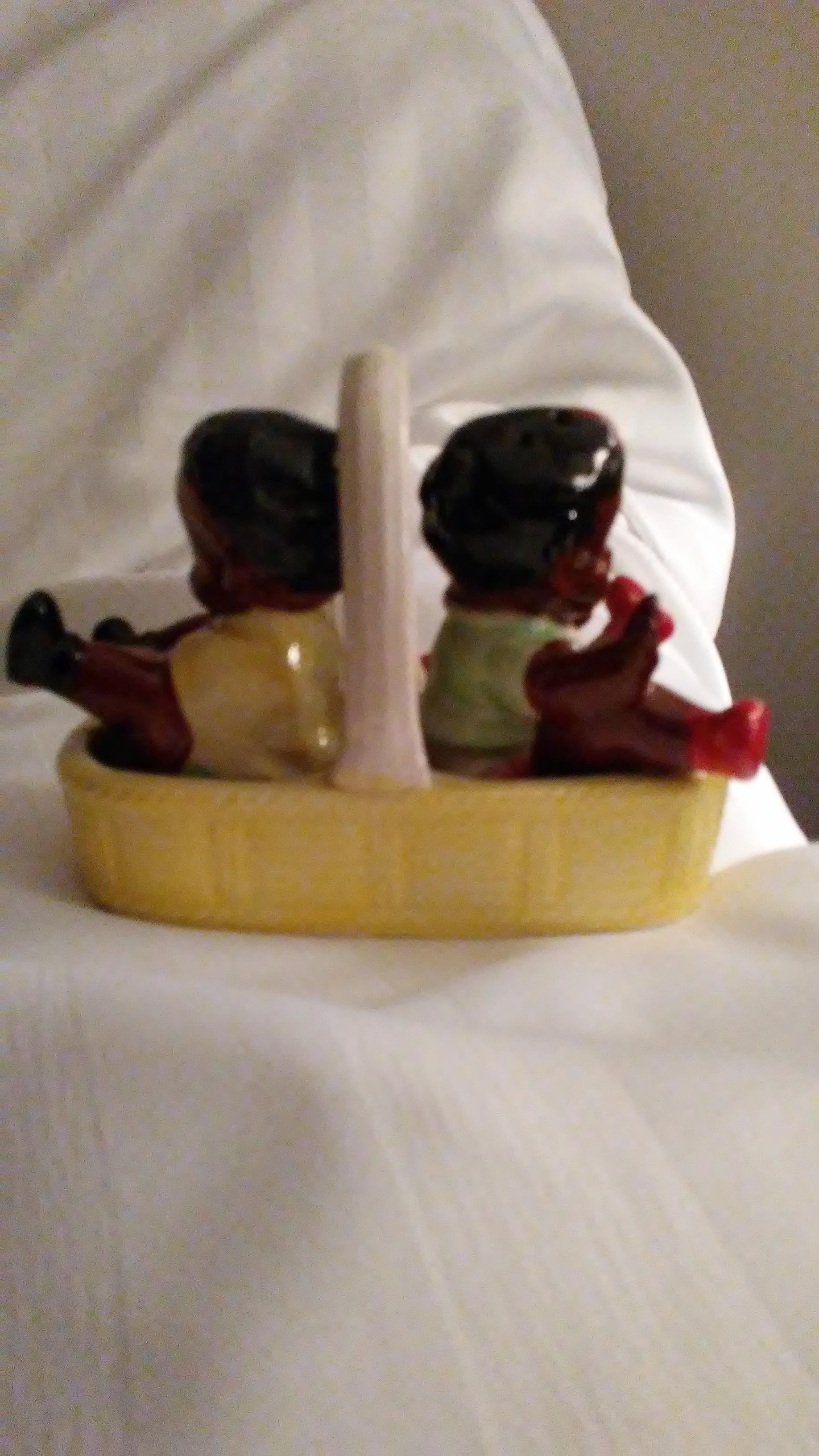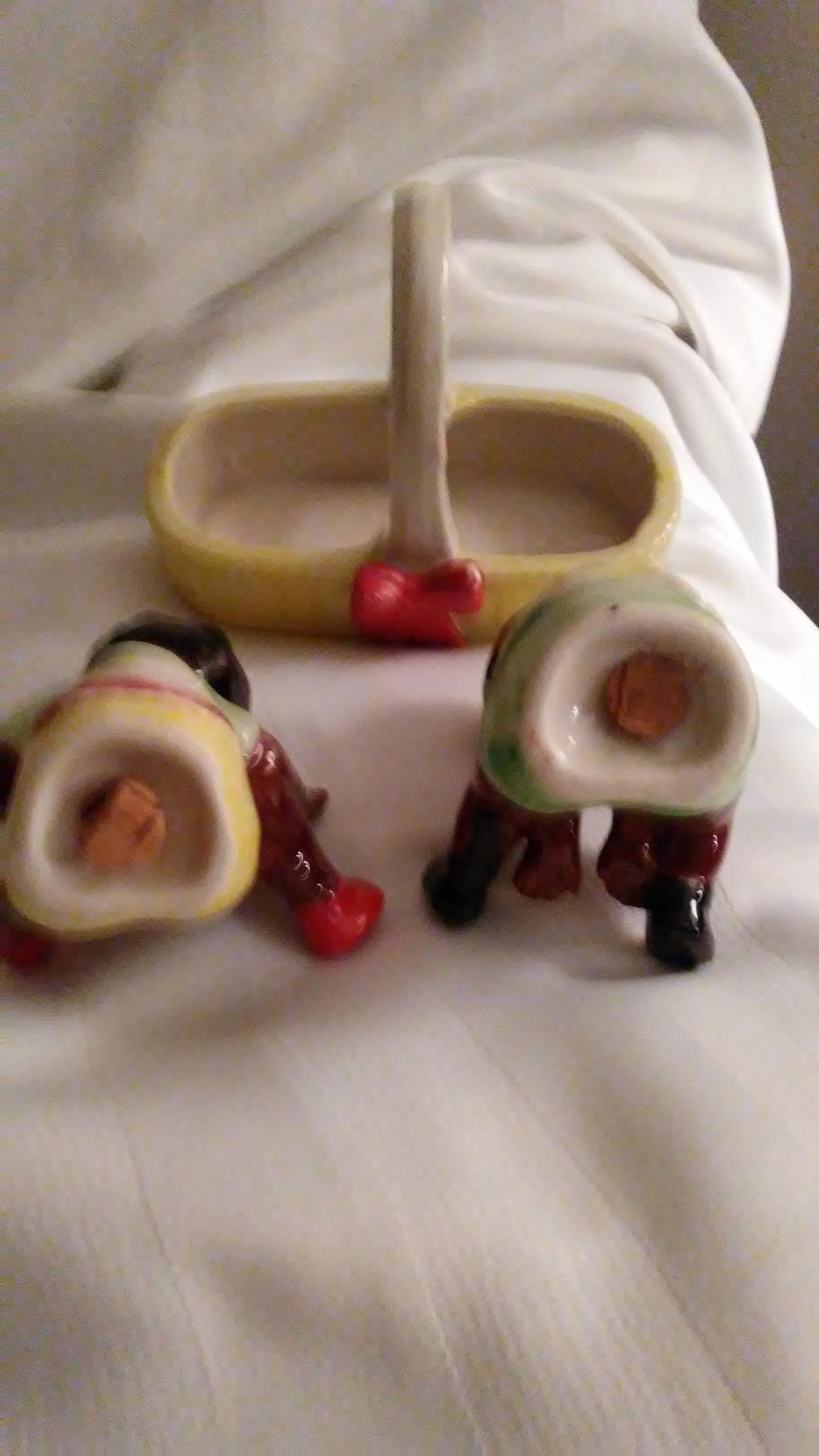 Boy and girl in basket, corks in bottoms, Japan stamped on bottom of shakers