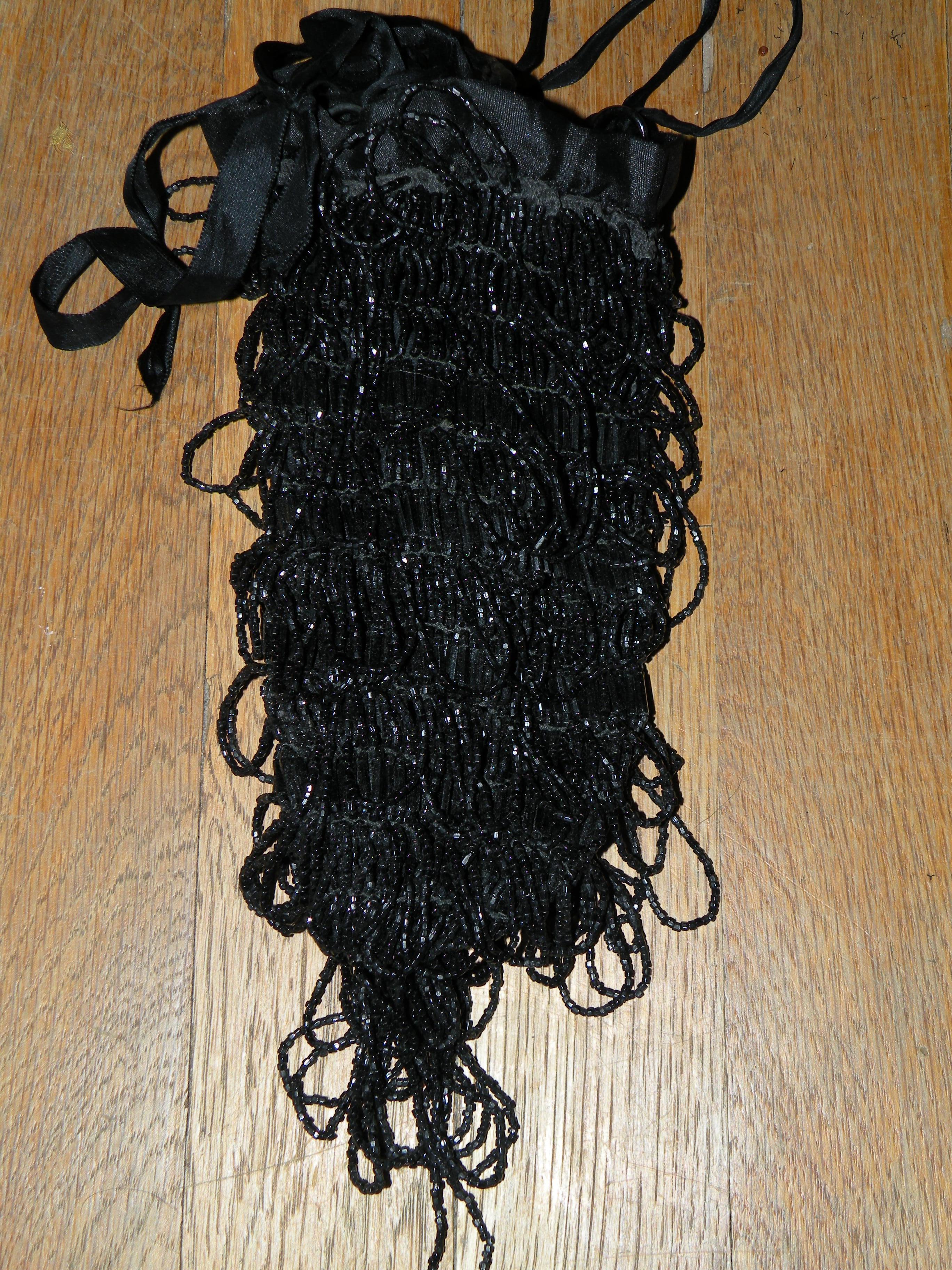 The purse has tiny black beads and black maybe linen on the inside. I would guess it has thousands of beads.