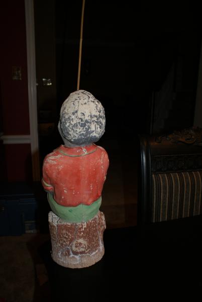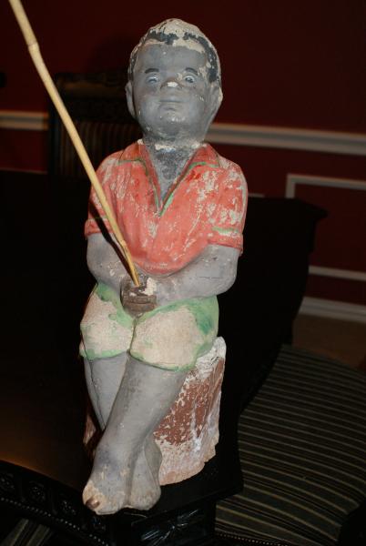 Black Fishing boy garden decoration. He is sitting on a log and is holding a fishing pole. I was told by the owner that this piece dates back to 1920's. Its rare and is collectible. I am looking for some estimates as i want to put it up for auction.