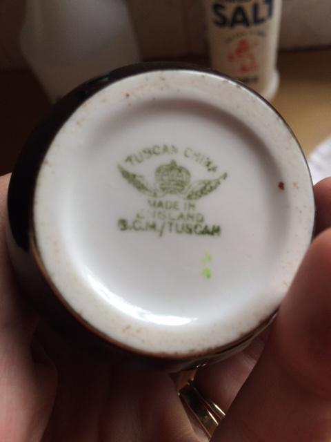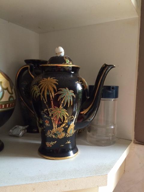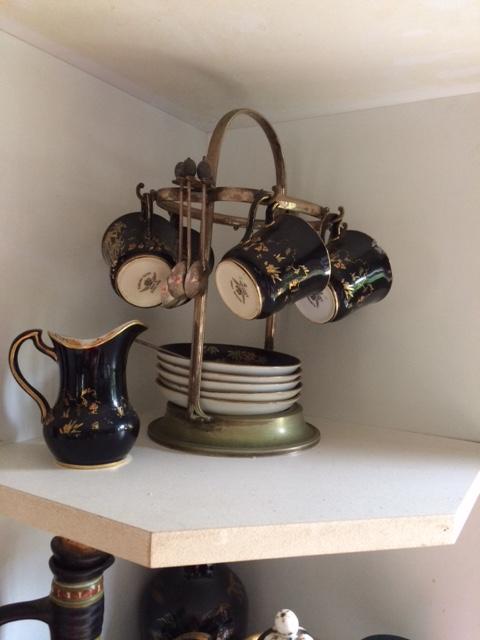 Full set of black and gold tea set on stnd with Tea Pot, Sugar bowls and Milk Jug.