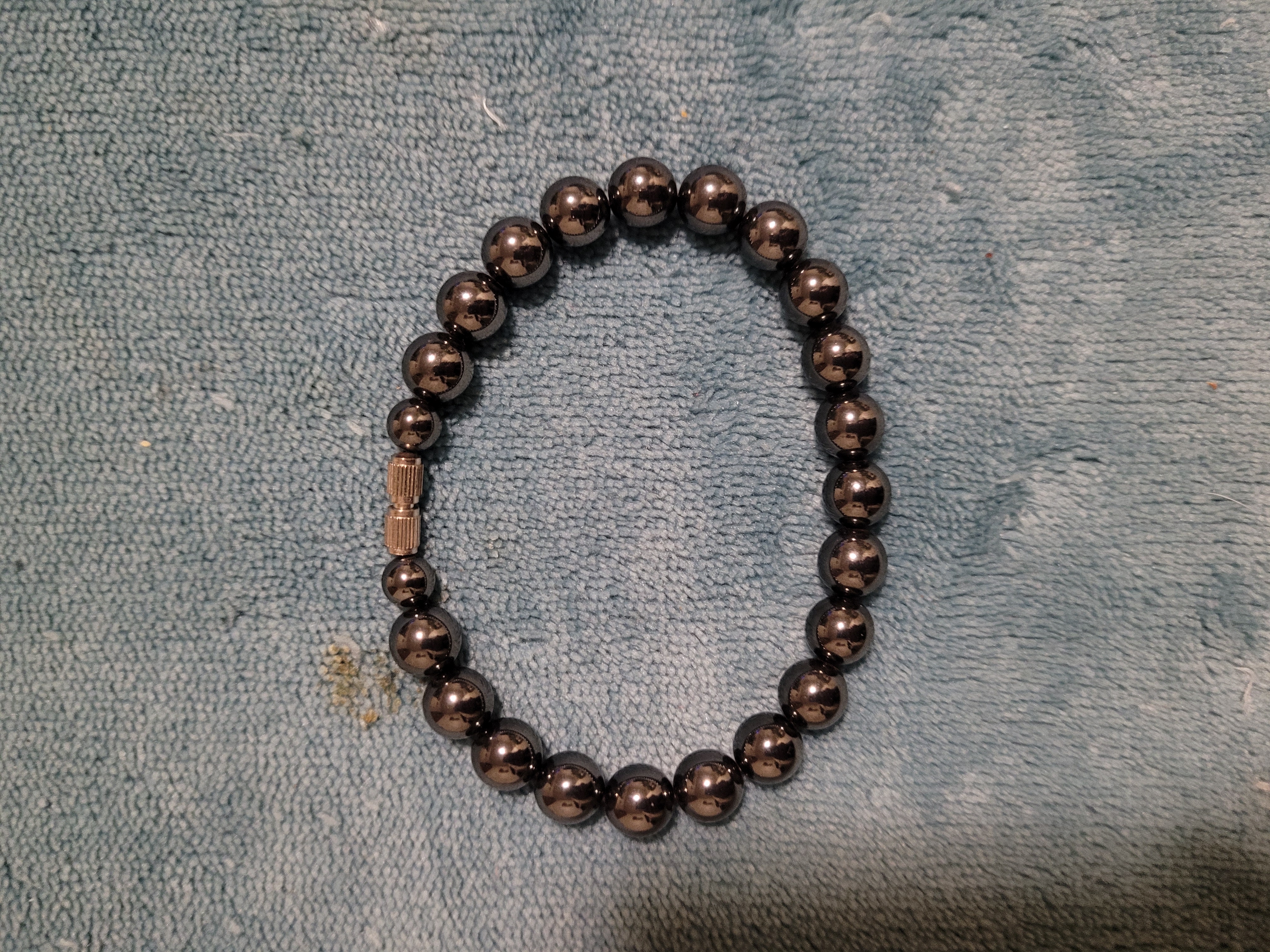 Detailed Physical Description: This black hematite bracelet features a series of polished spherical beads, each exhibiting a smooth, reflective surface characteristic of hematite. The bracelet is secured with a metal clasp, which appears to be in good condition. The precise dimensions and weight are not provided, but typical hematite beads range from 6mm to 10mm in diameter. The bracelet's overall design is simple yet elegant, making it suitable for both casual and formal wear.